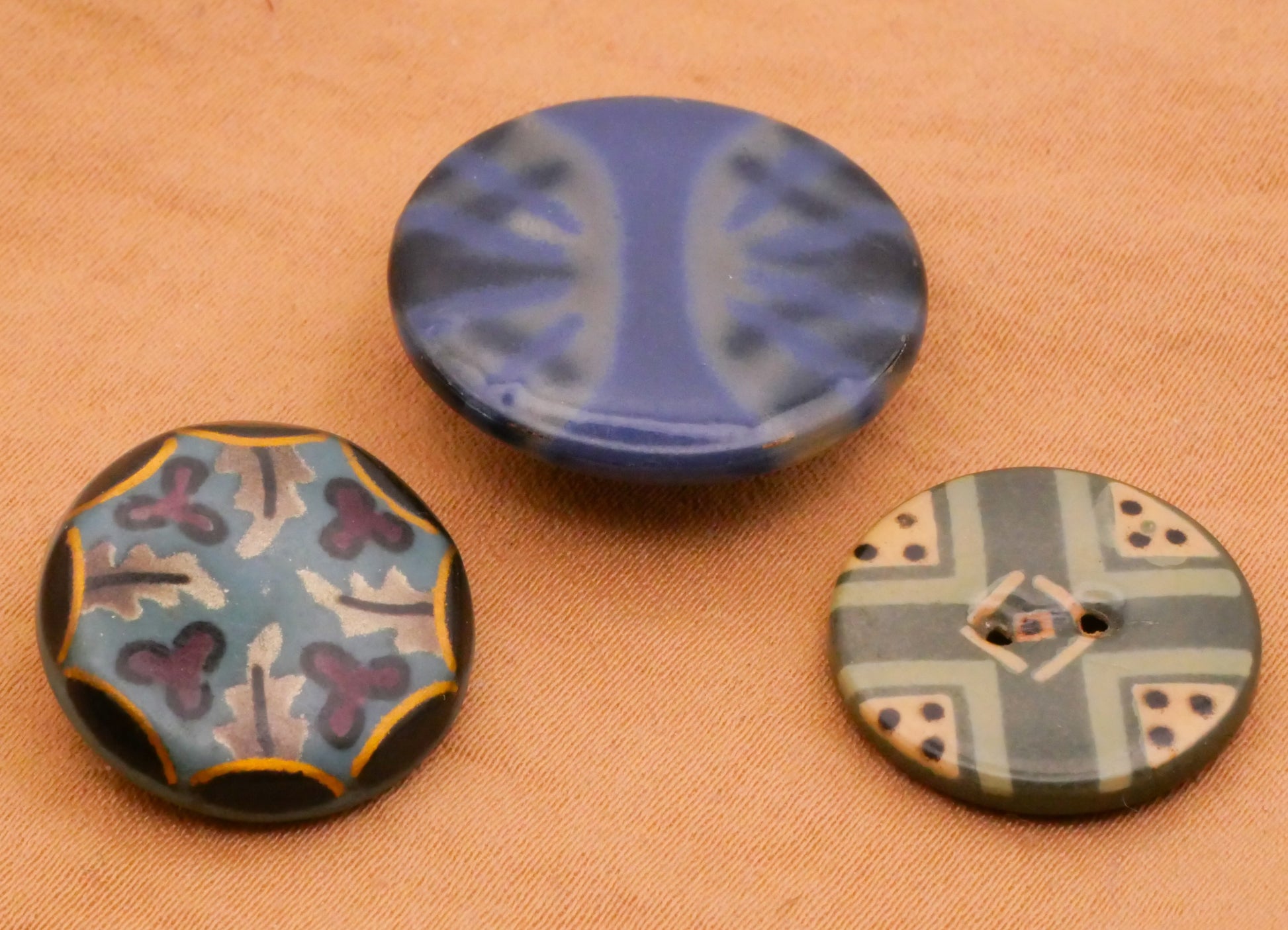 Lovely selection of quadrant design celluloid buttons in shades of blue and blue-green. These measures between 17-23mm / .67"-.91". Choose left, center, or right.
