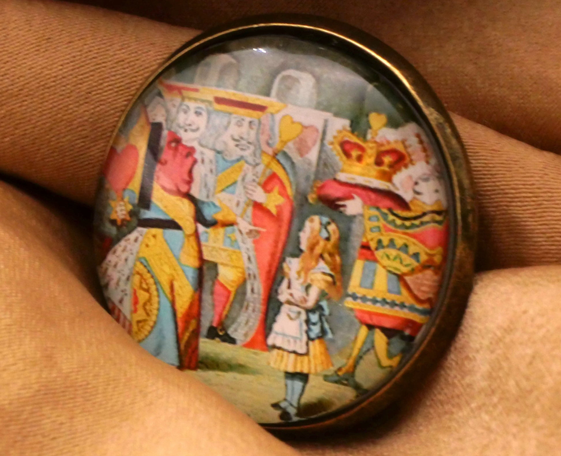 Off with their heads! This dome glass button depicts the Queen of Hearts and Alice in a scene from John Tenniel's The Nursery Alice / Alice's Adventures in Wonderland (1890). This measures 28mm / 1.1" in diameter and is set in a bronze button base.