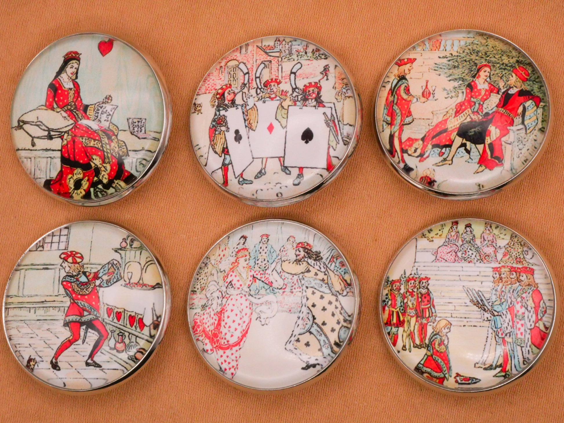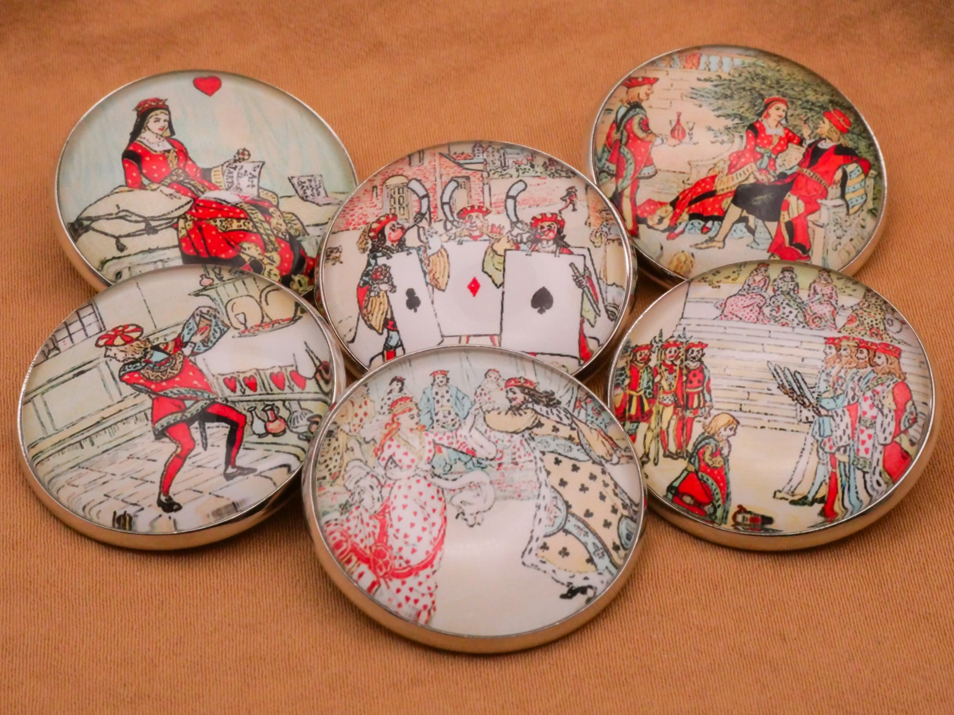 "The Queen of Hearts, she made some tarts, All on a summer day: The Knave of Hearts, he stole those tarts, And took them clean away!" Fantastic reproductions of illustrations by Randolph Caldecott in The Queen of Hearts picture book. Each glass and silver metal button measures 27mm / 1.06" in diameter. Choose top or bottom and left, center, or right.