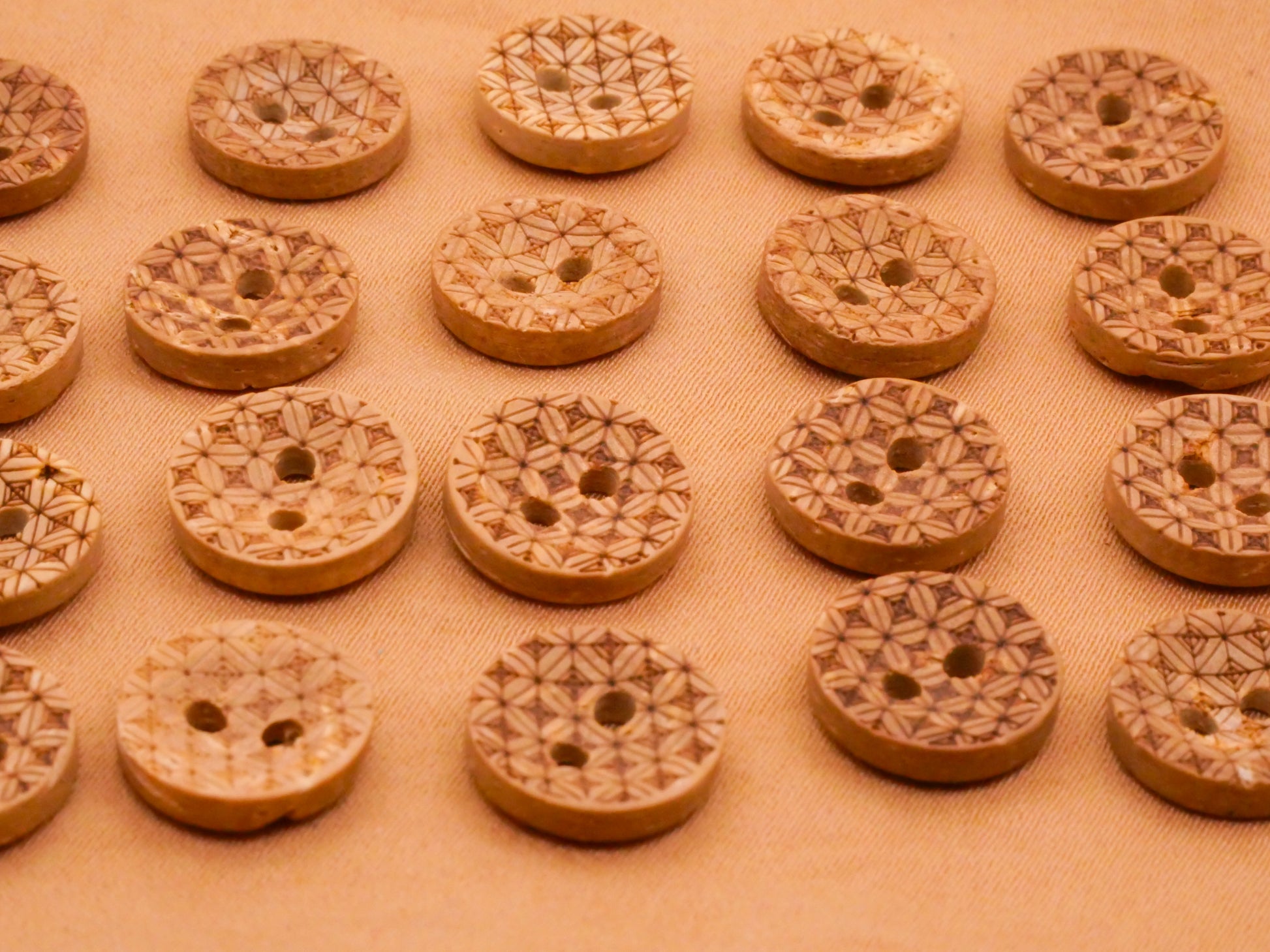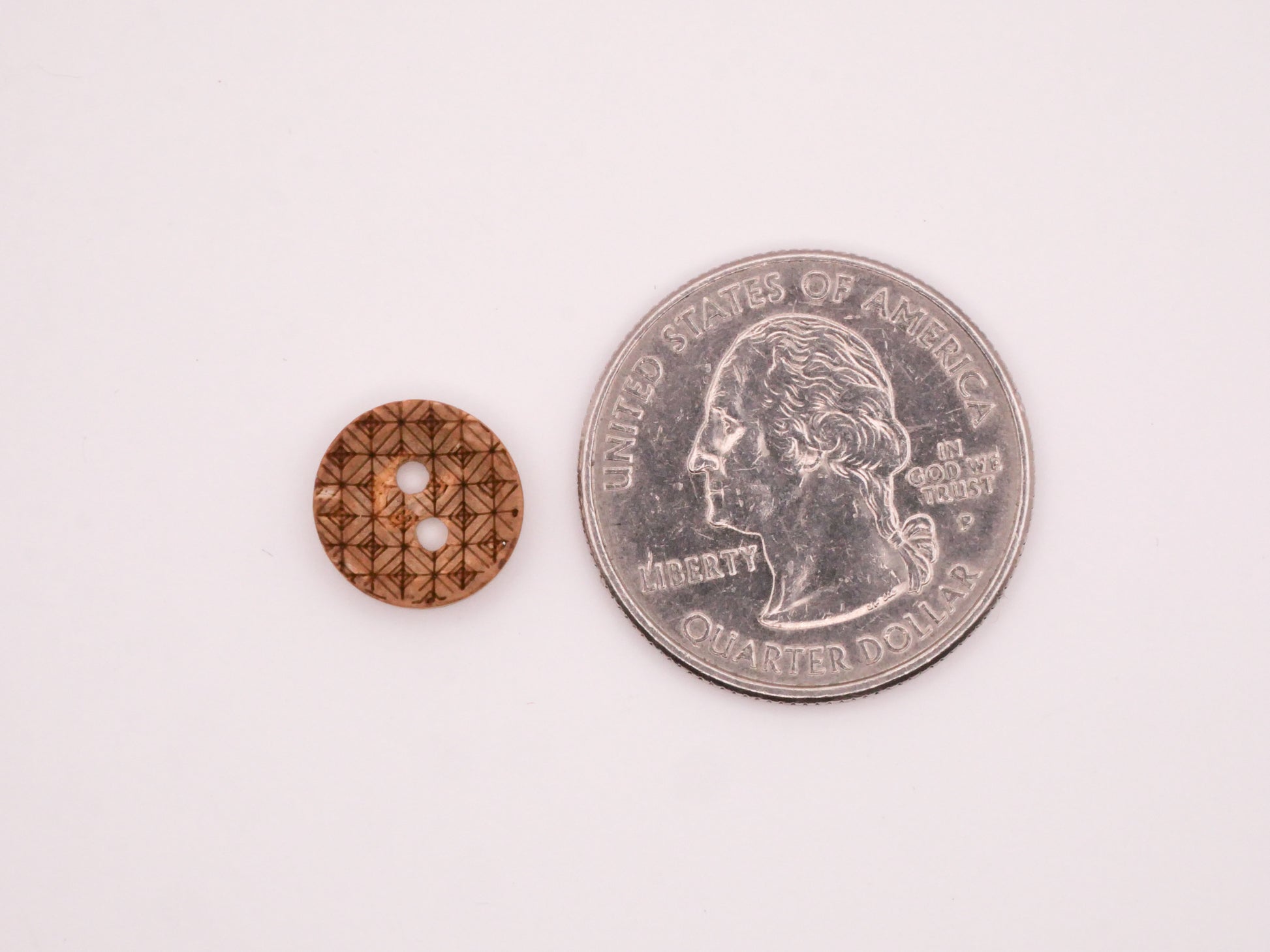 Lovely quilted look design on these laser cut coconut shell button. Sold in set of twenty. Each measures 11mm / .43".