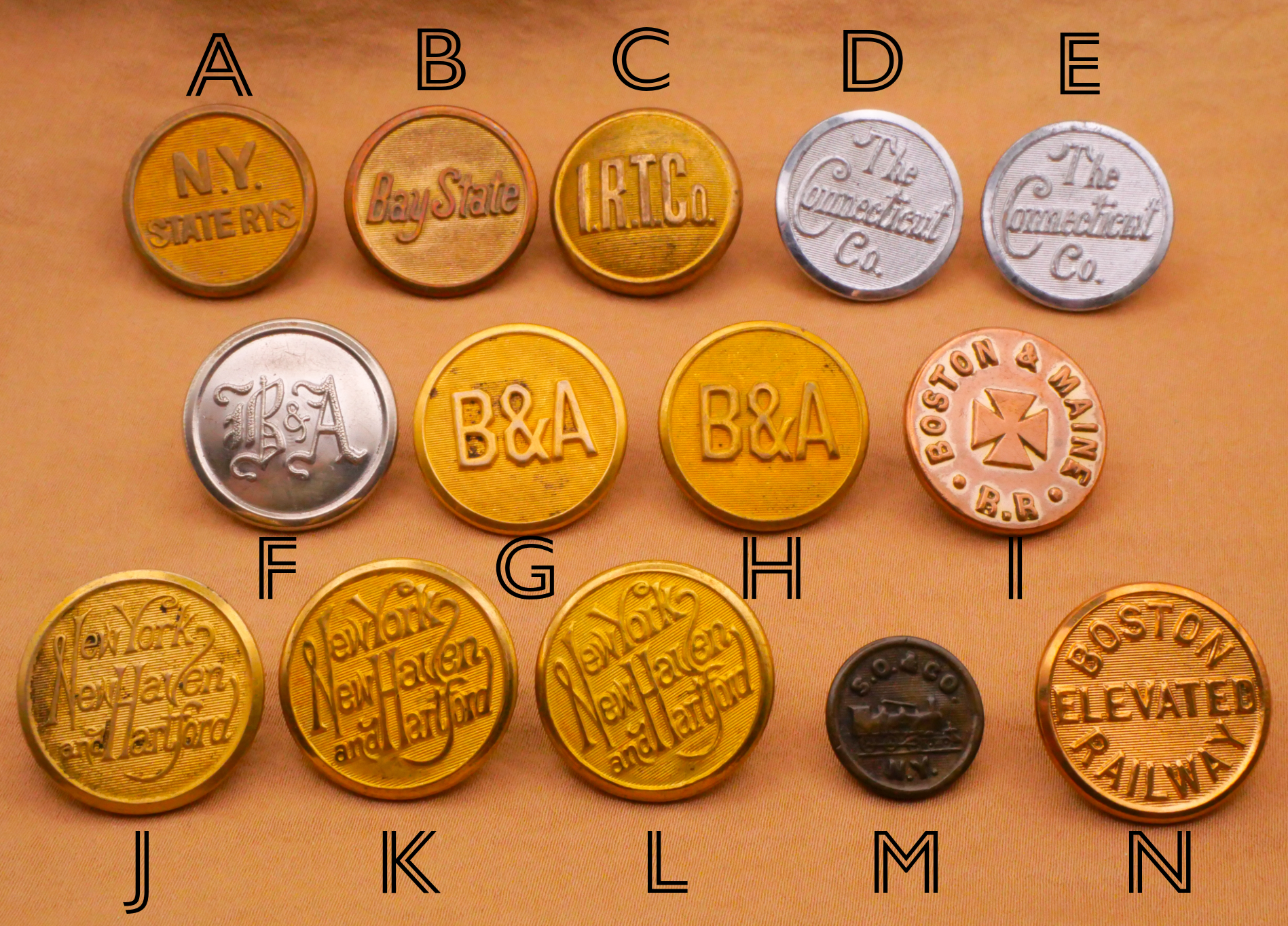 Excellent selection of US Northeast region railroad and transportation buttons, choose your favorite. Options include B&A, The Connecticut C0, New York New Haven & Hartford, Bay State, Boston & Maine, and more! These metal buttons measure between 15-23mm / .59"-.91". Choose A-N.