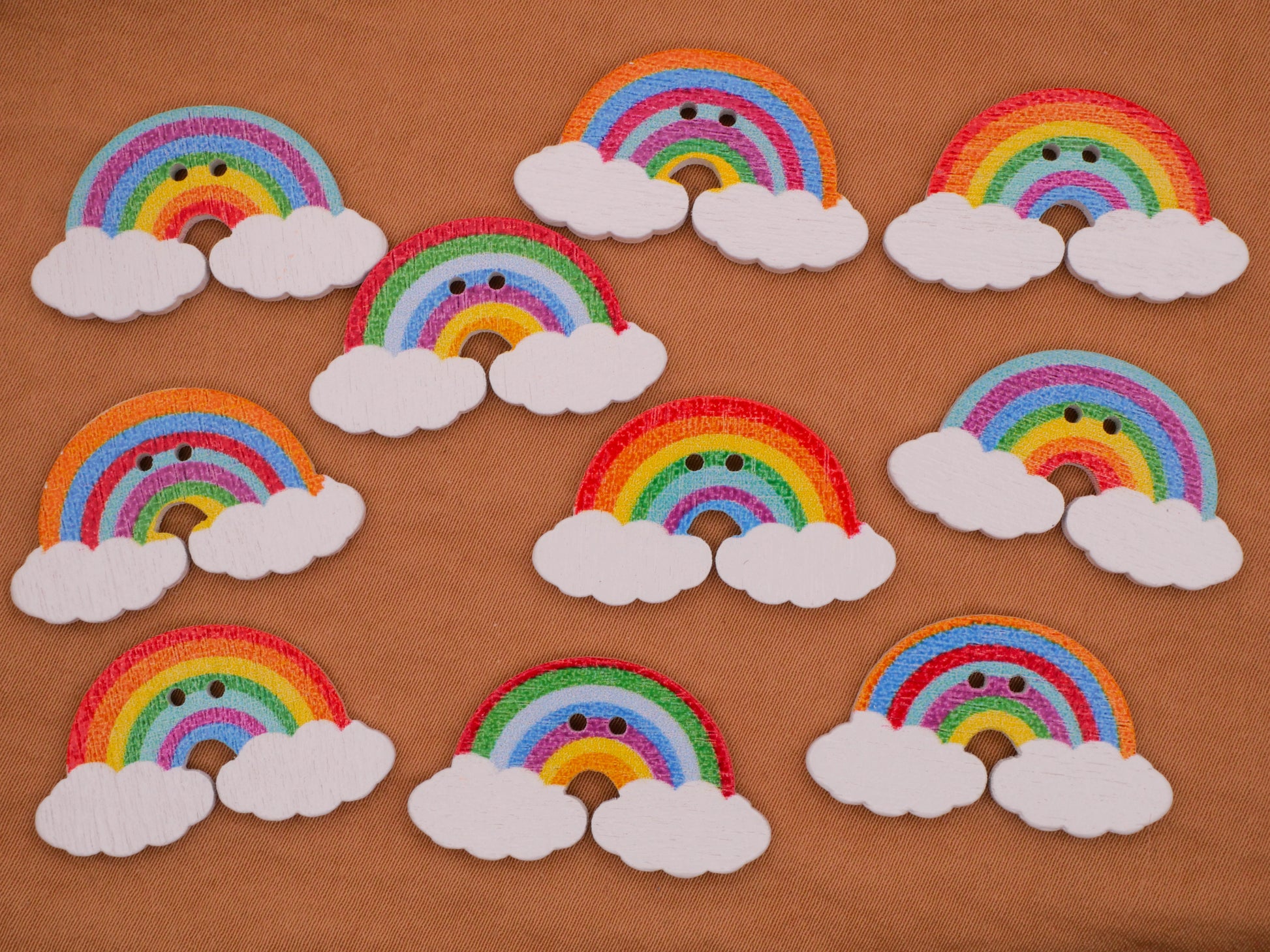 Somewhere over the rainbow! Fun set of ten wood rainbow buttons. Each measures 17 x 30mm / .67" x 1.18".