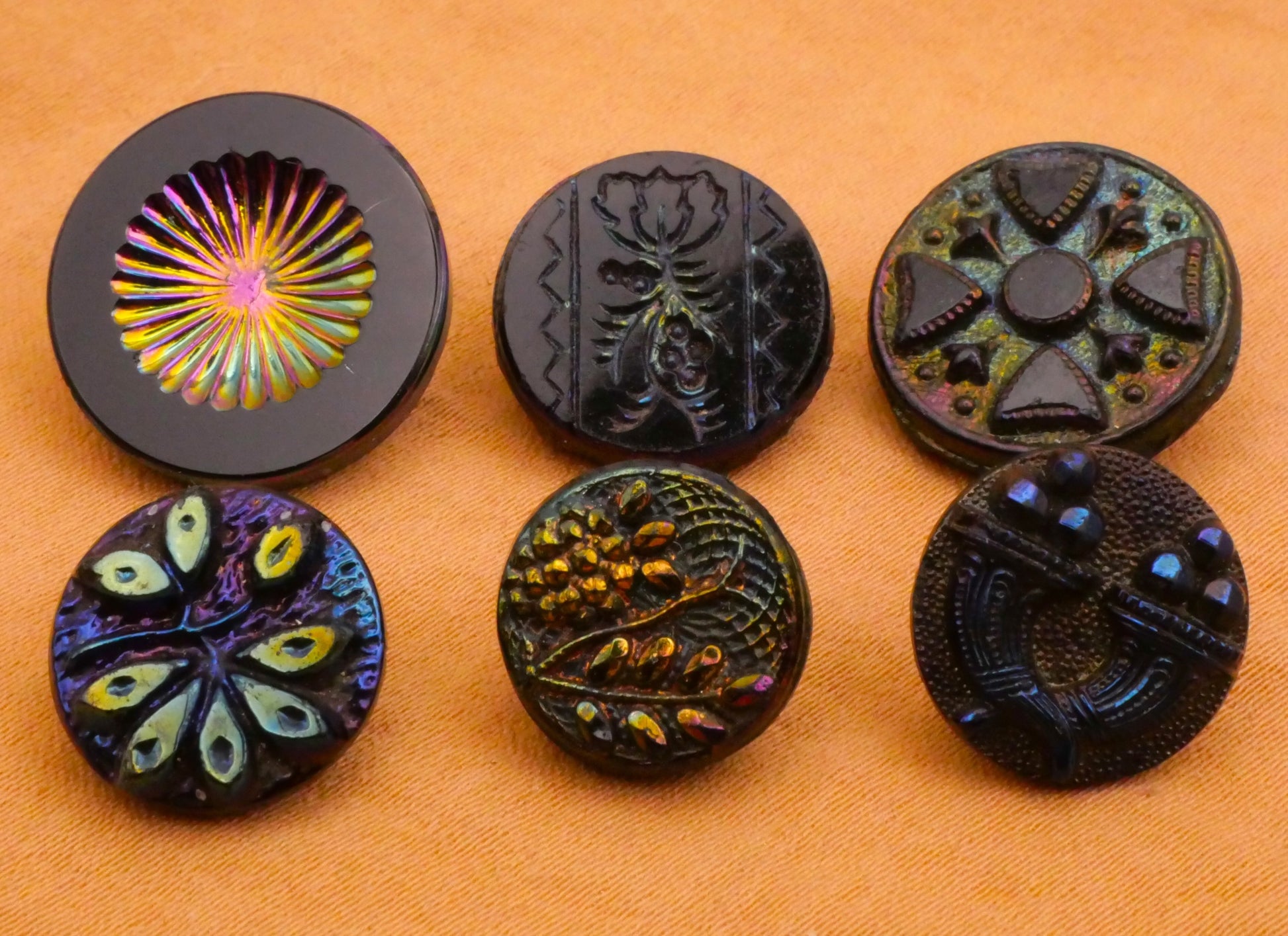 Gorgeous rainbow iridescent luster black glass buttons, choose your favorite! Choose top or bottom and left, center, or right.