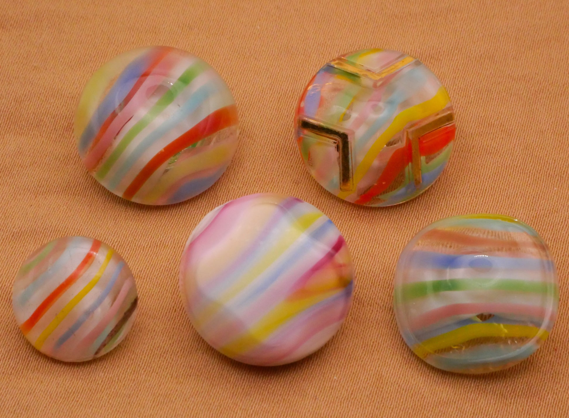 Wow! Love these rainbow stripe design in glass dig dug buttons. These vintage buttons measure between 13-18mm / .51"-.71". Choose top or bottom and left, center, or right.