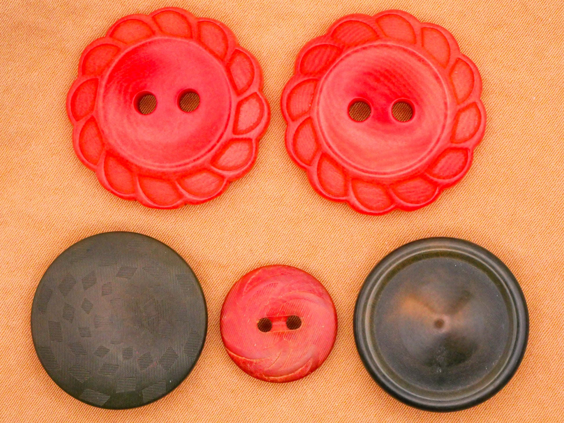 Red and green vegetable ivory tagua nut vintage buttons, choose your favorite! Love the red flowers! And bottom left has MC Escher look design and four-way shank! These measure between 15-27mm / .59"-1.06". Choose top or bottom and left, center, or right.