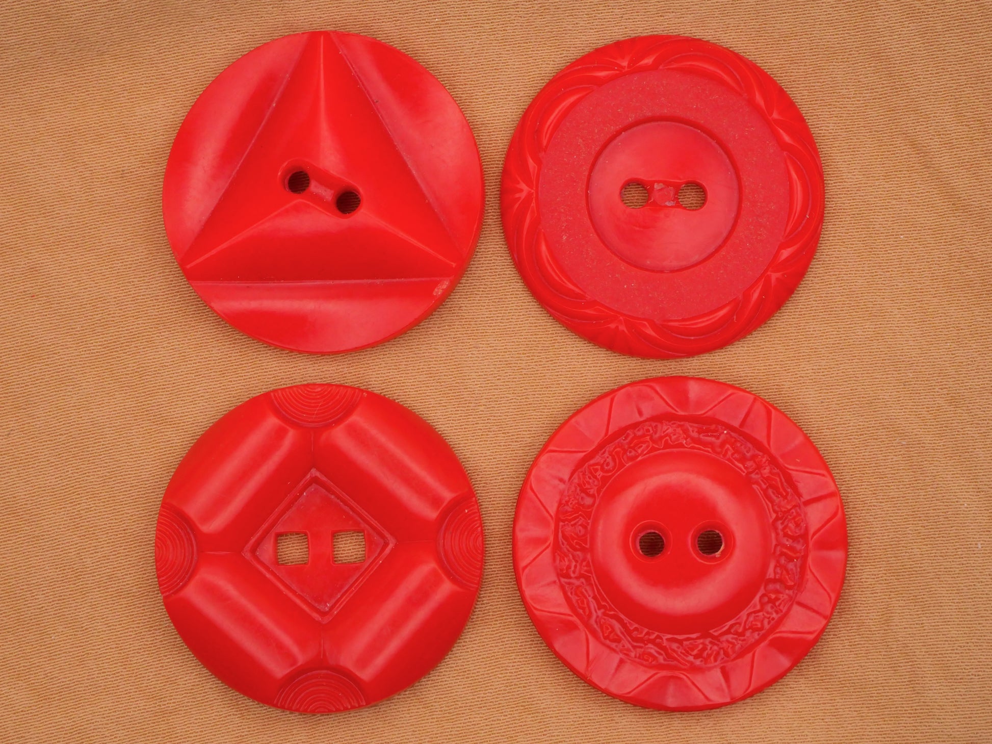 Choose your favorite! Vintage red plastic sew-thru buttons in various styles. Each measures 27mm / 1.06" in diameter.