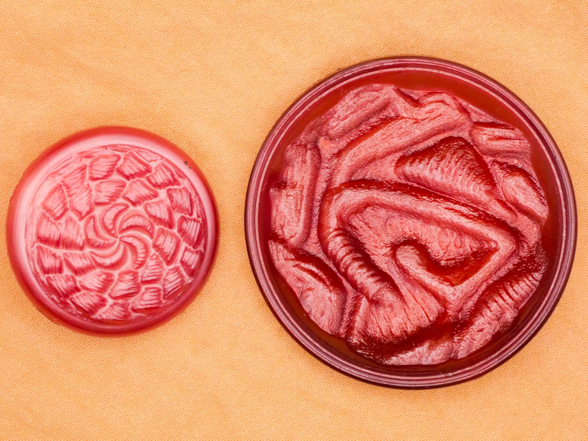 Excellent sculptural texture vintage plastic buttons in purply pink red tones with a little shimmer. These measure between 28-44mm / 1.1"-1.73" in diameter. Choose left or right.
