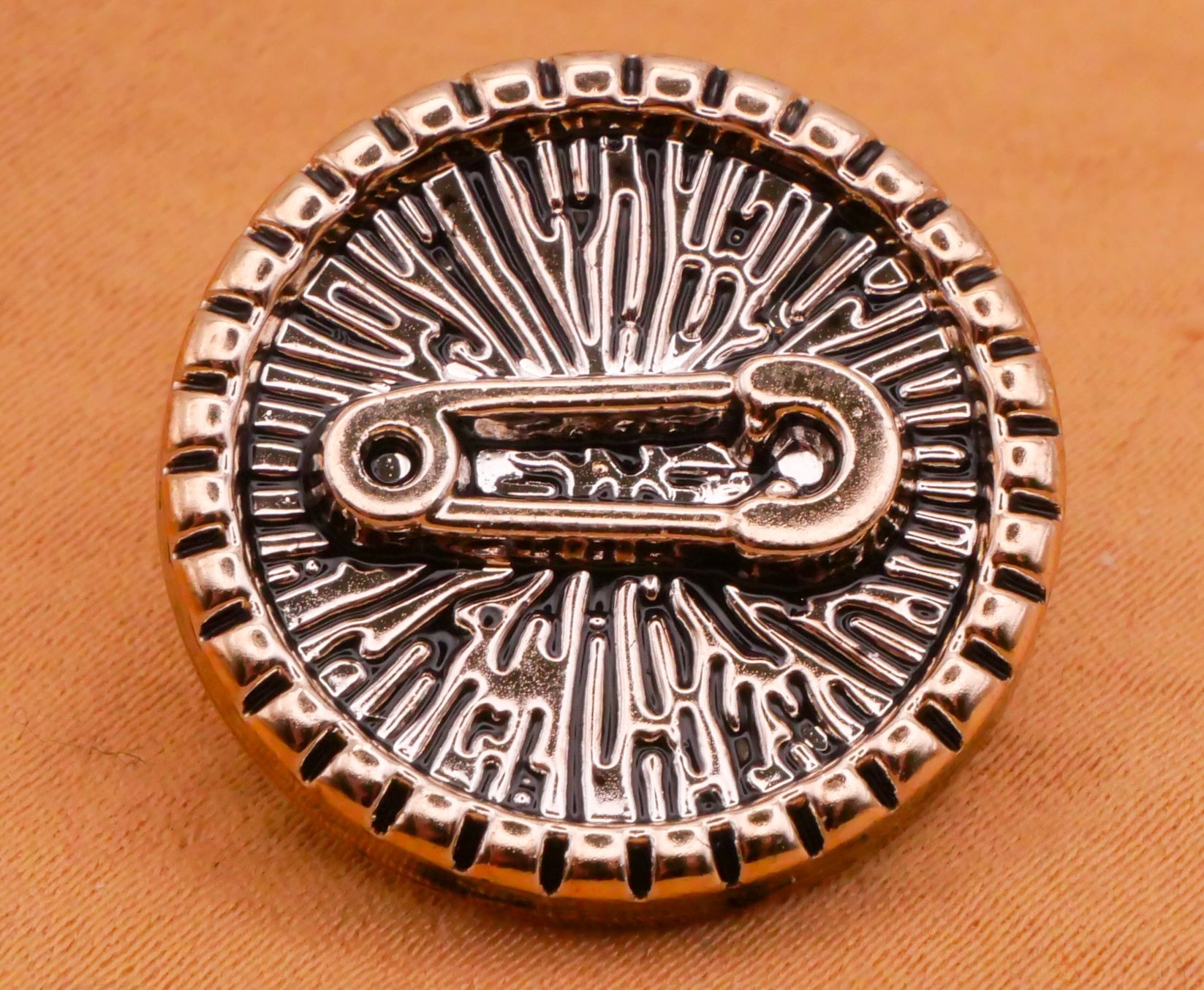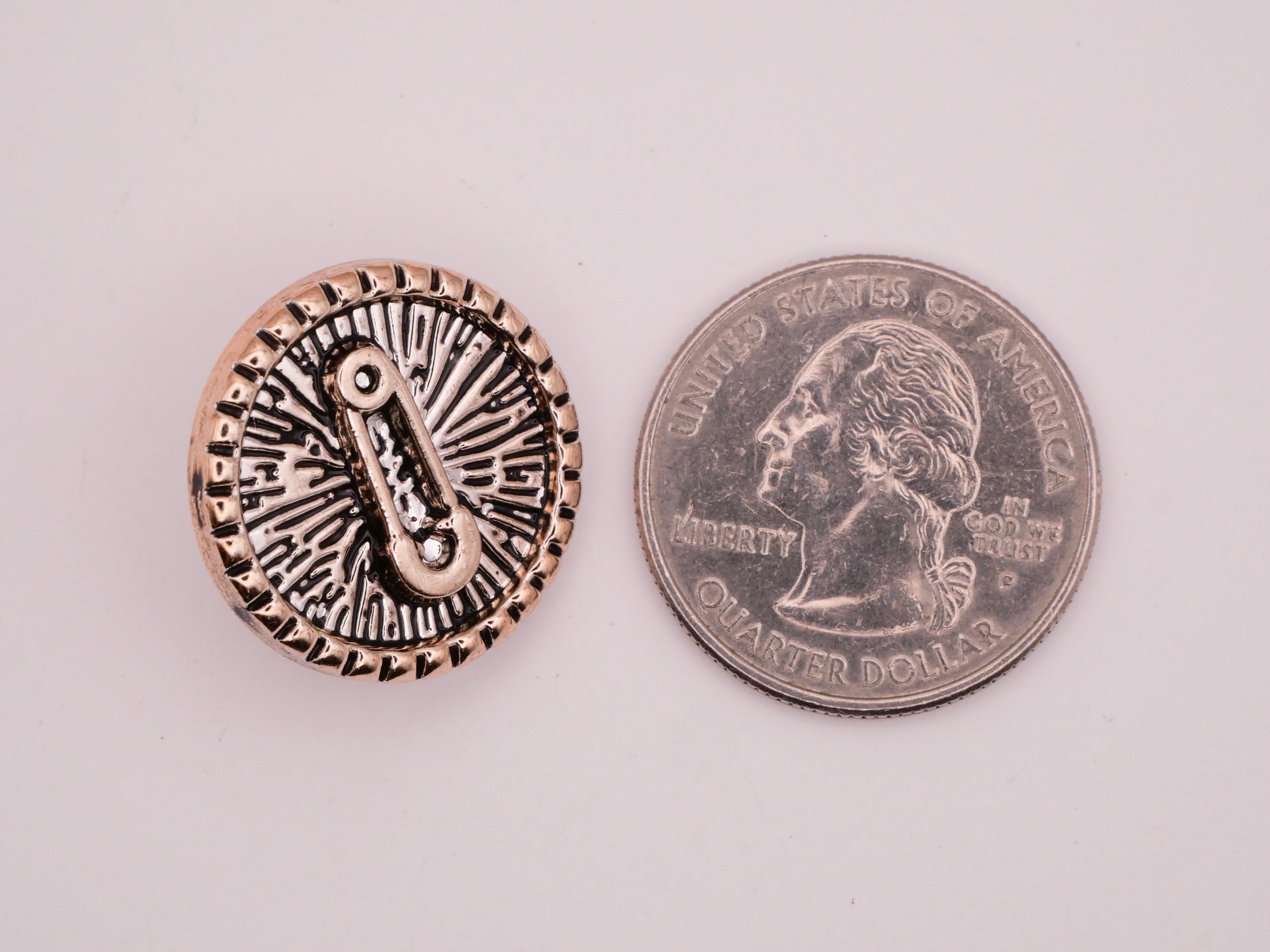 Interesting textured metallic look plastic buttons with safety pin design. Sold in pair. Each measures 22mm / .87" in diameter.