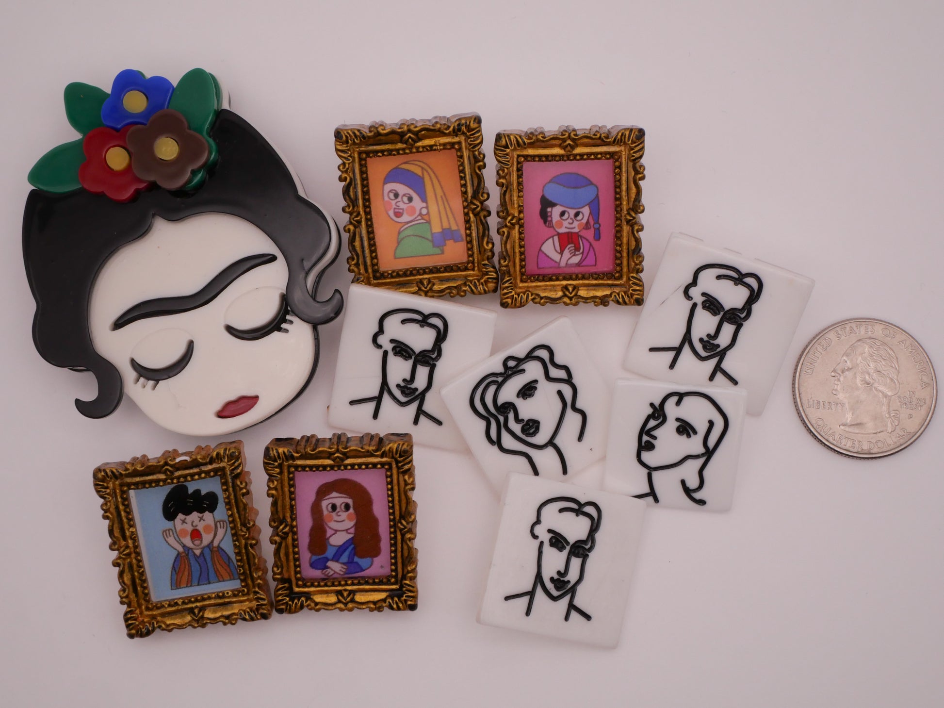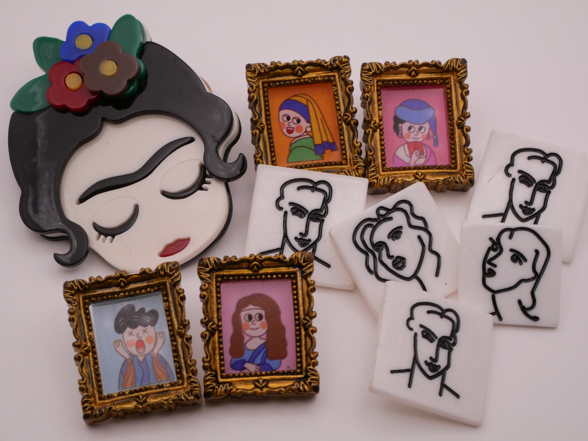 Art inspired buttons in plastic including large Frida, frames, and Matisse inspired.