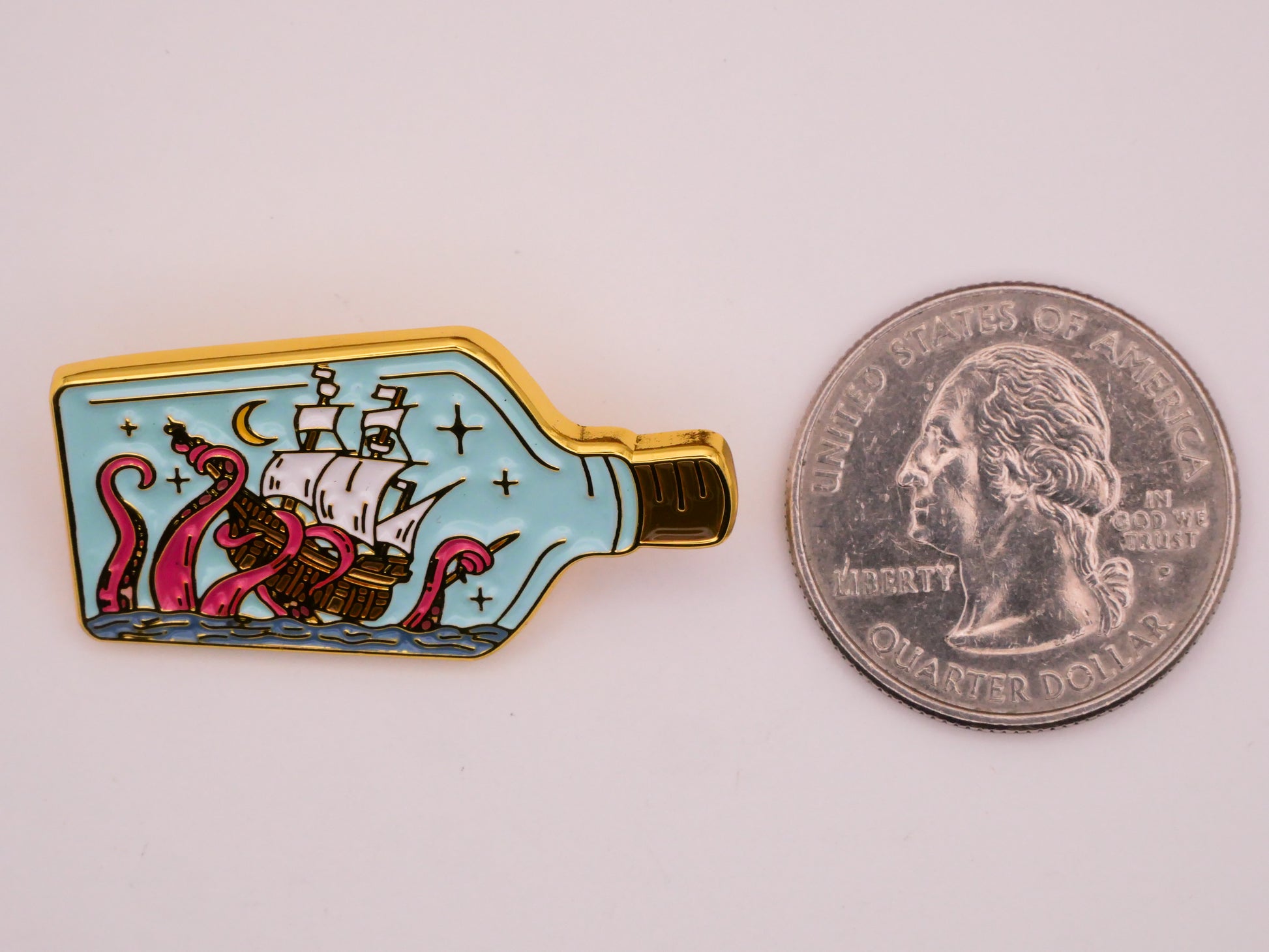 Excellent ship in a bottle enamel button! Love the octopus and the moon and stars in the night sky, so cool! Measures a large 20 x 36mm / .79" x 1.42".