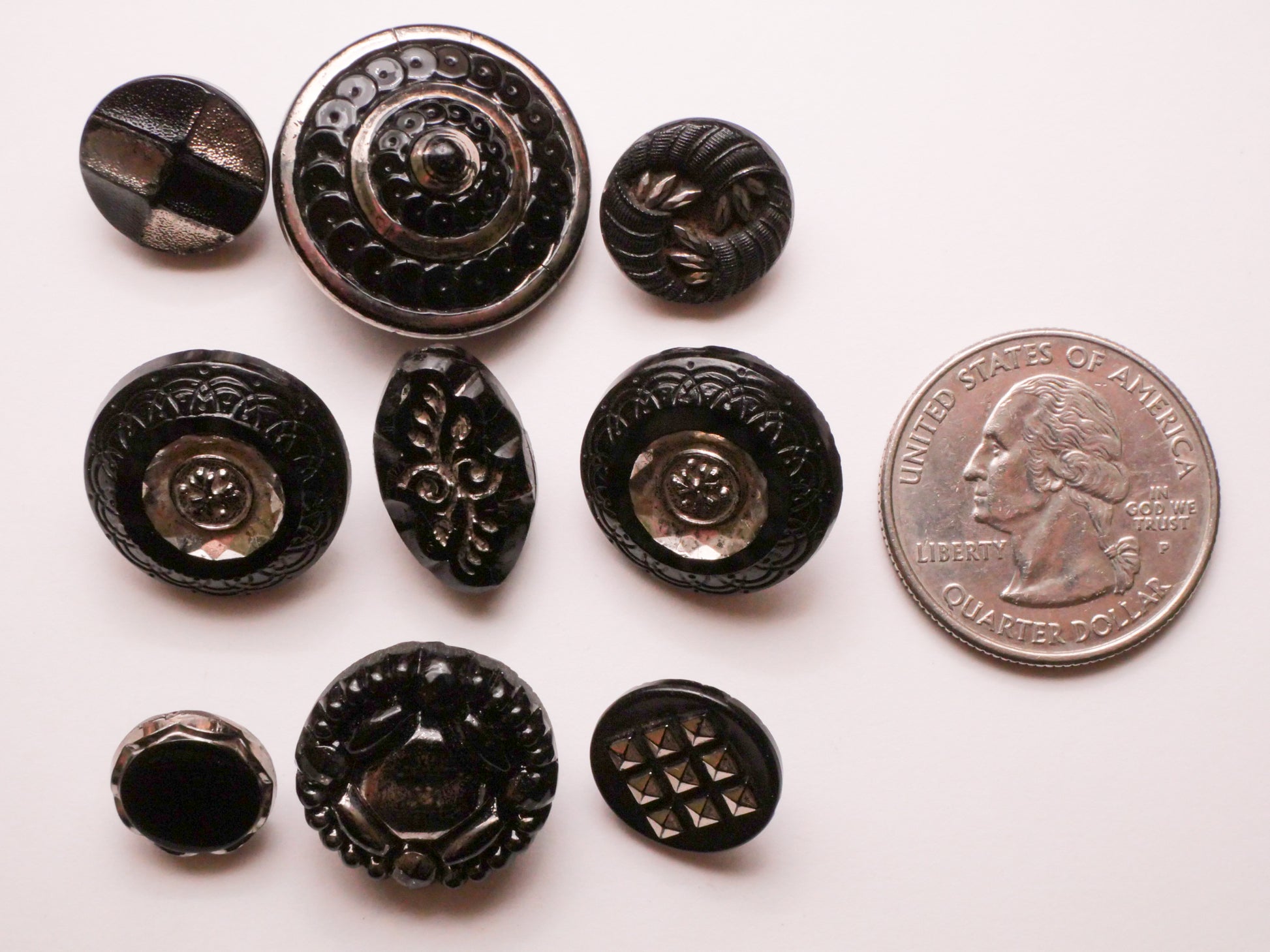 Wonderful selection of vintage and antique black glass buttons with silver accents. Top center is interesting and looks like sewn sequins! These measure between 11-23mm / .43"-.91". Choose top, middle, or bottom and left, center, or right.