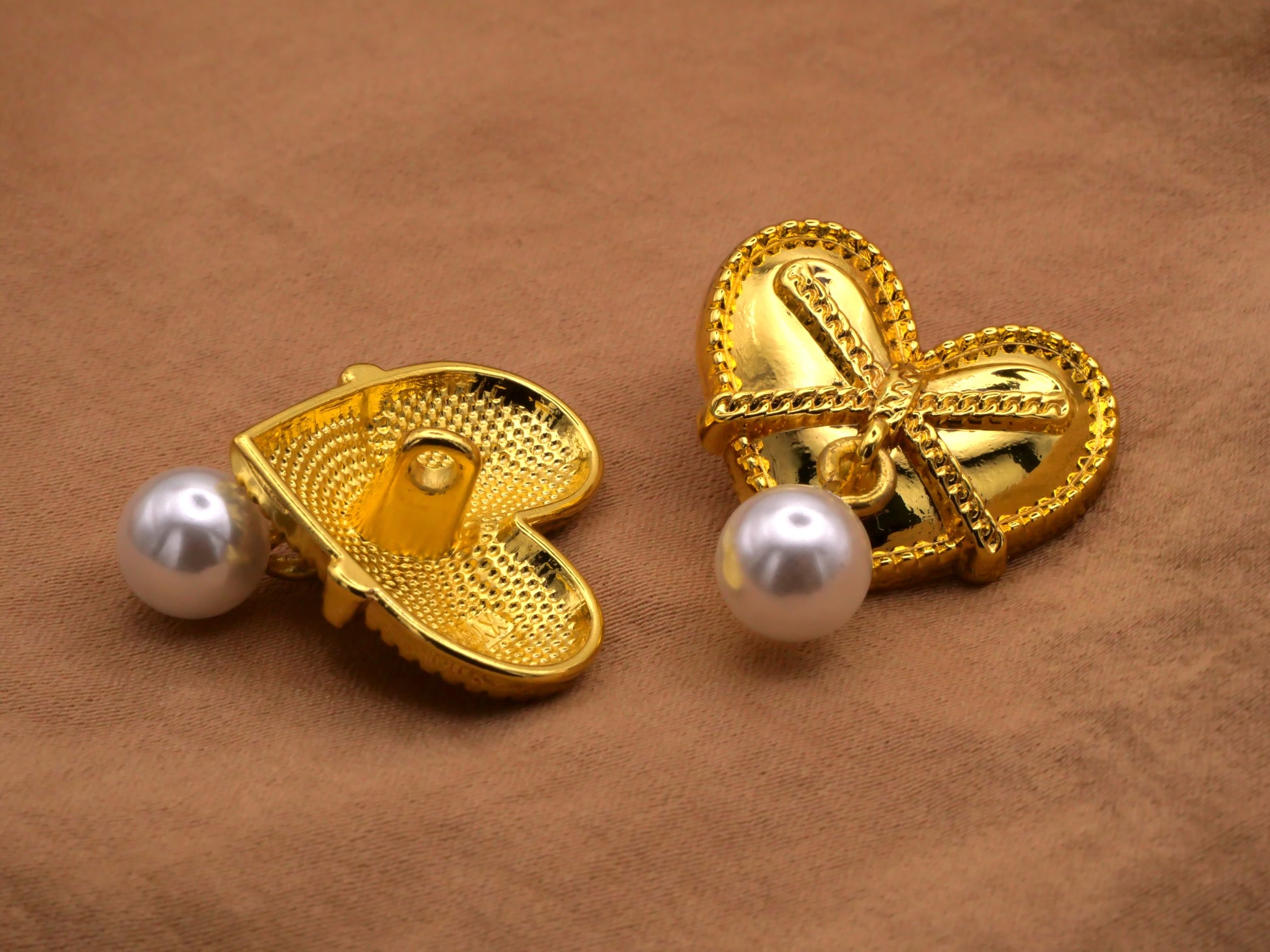 Silver Gold Heart with Bow and Dangling Pearl Button 23x24mm