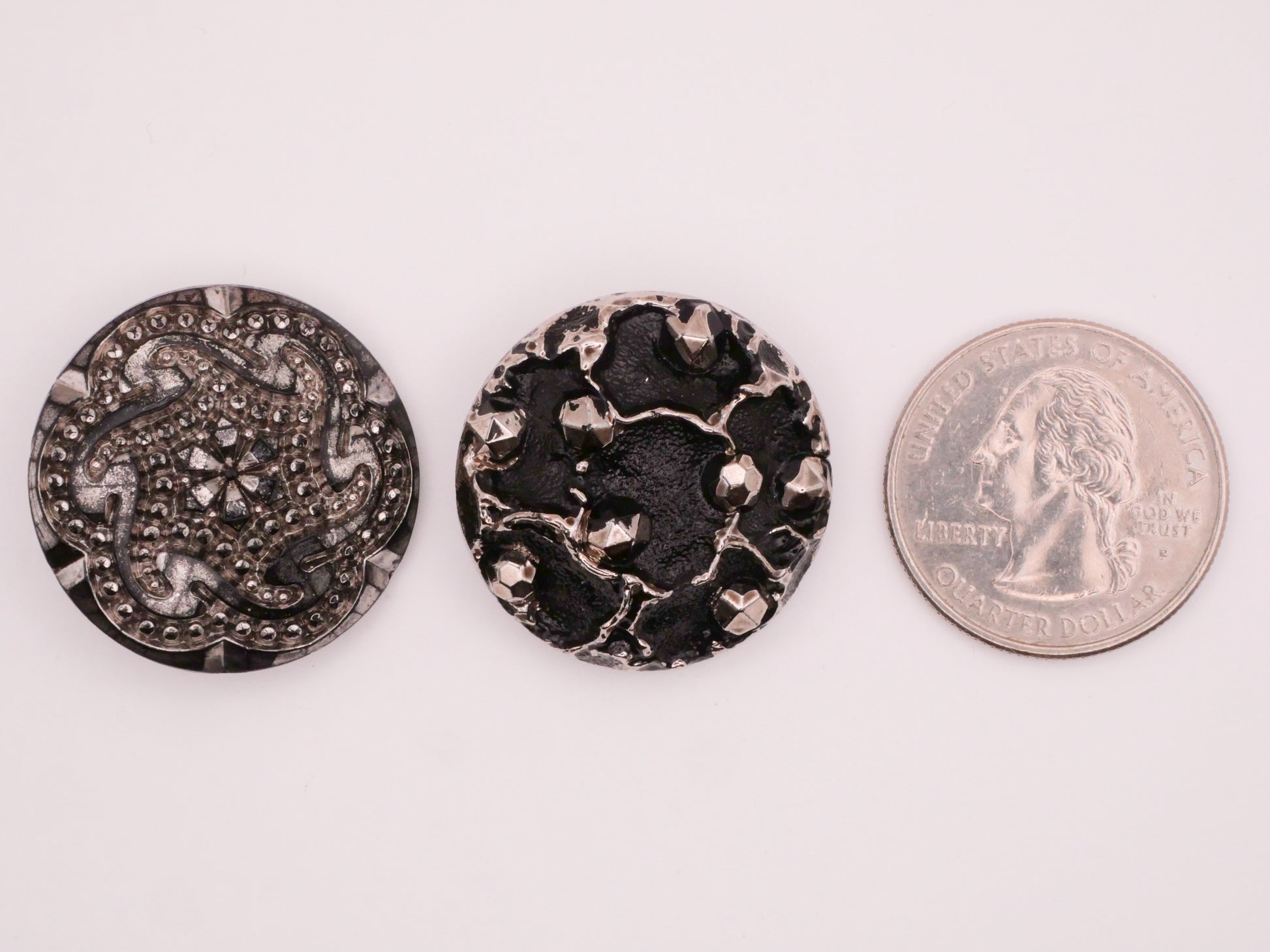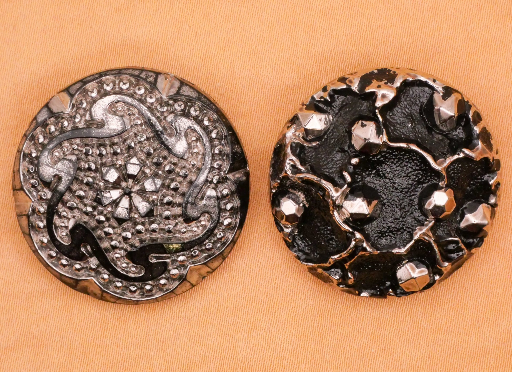 Fantastic black and silver luster buttons. Left has art nouveau look whirlpool or galaxy look and right has a crater look with faux steel cuts. These measure between 26-27mm / 1.02"-1.06". Choose left or right.