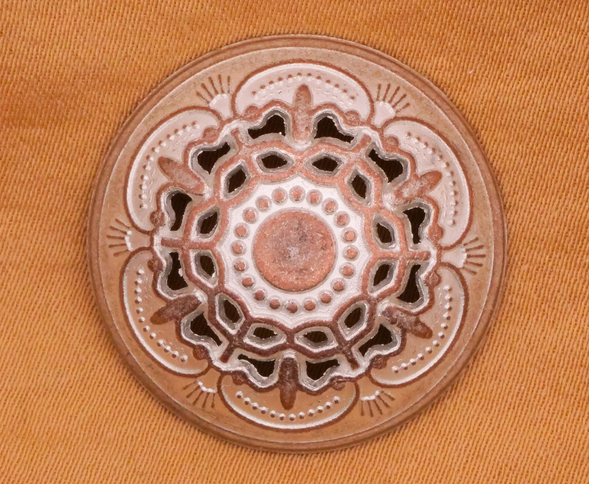 Beautiful white washed copper colored metal ornate snowflake look design. Button measures 25mm / .98" in diameter.