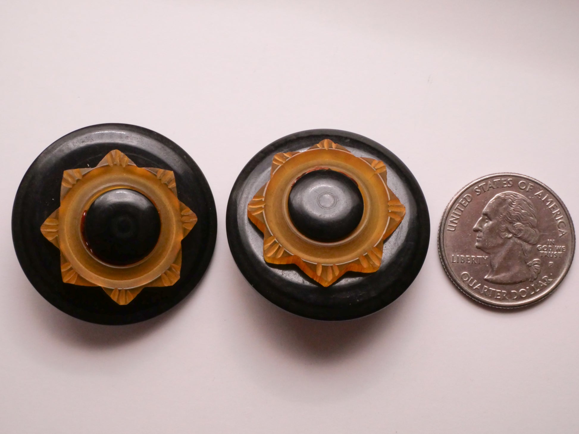 Amazing and unique star / snowflake design multi-part early plastic button. Black base and center piece with carved butterscotch look star in the center. Each measures a large 36mm / 1.42" across. Choose left or right.
