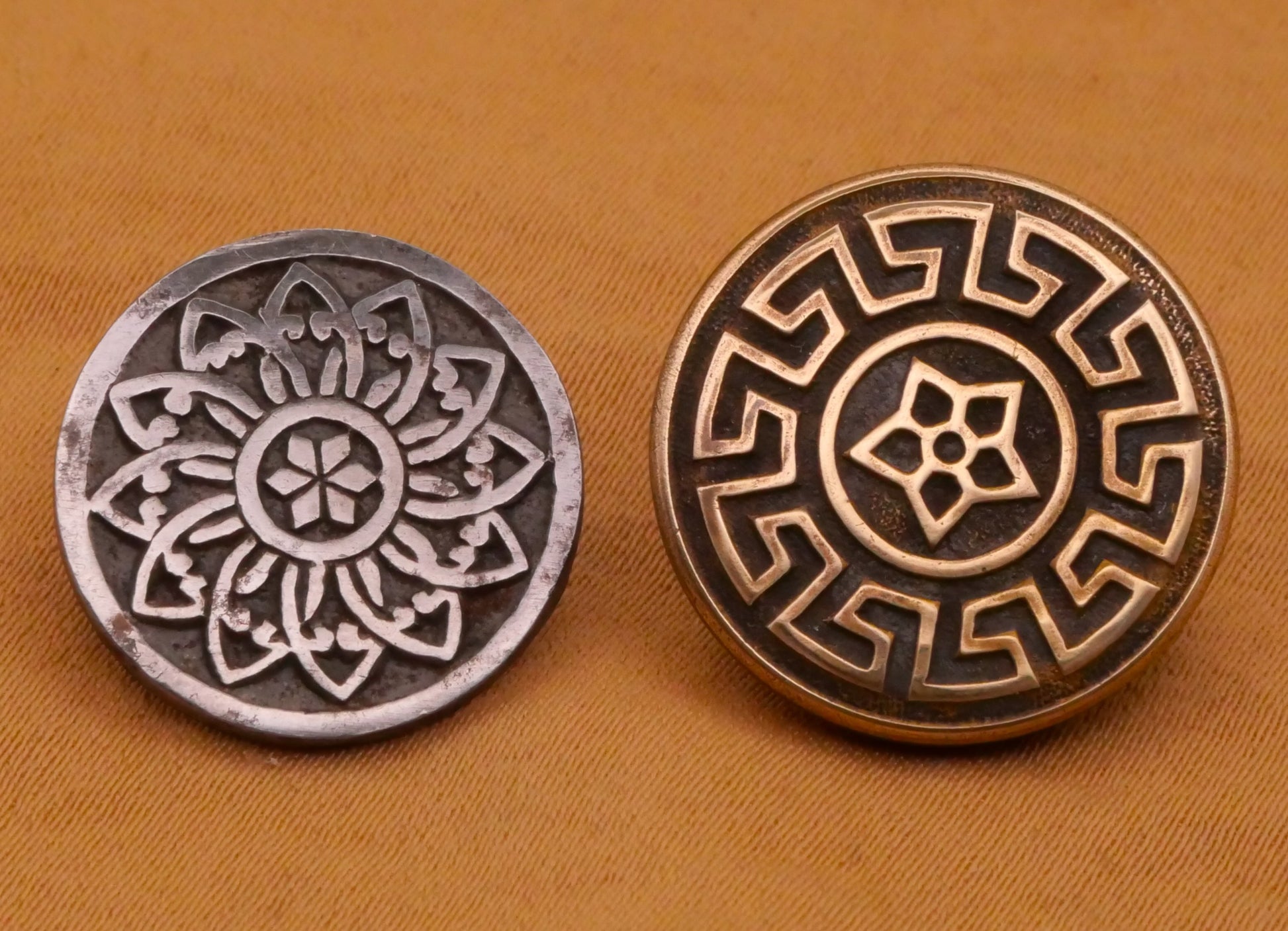 Fantastic star center Victorian metal buttons. Left is steel with mandala design and right has Aztec or greek key look frame. These measure between 18-20mm / .71"-.79" in diameter. Choose left or right.