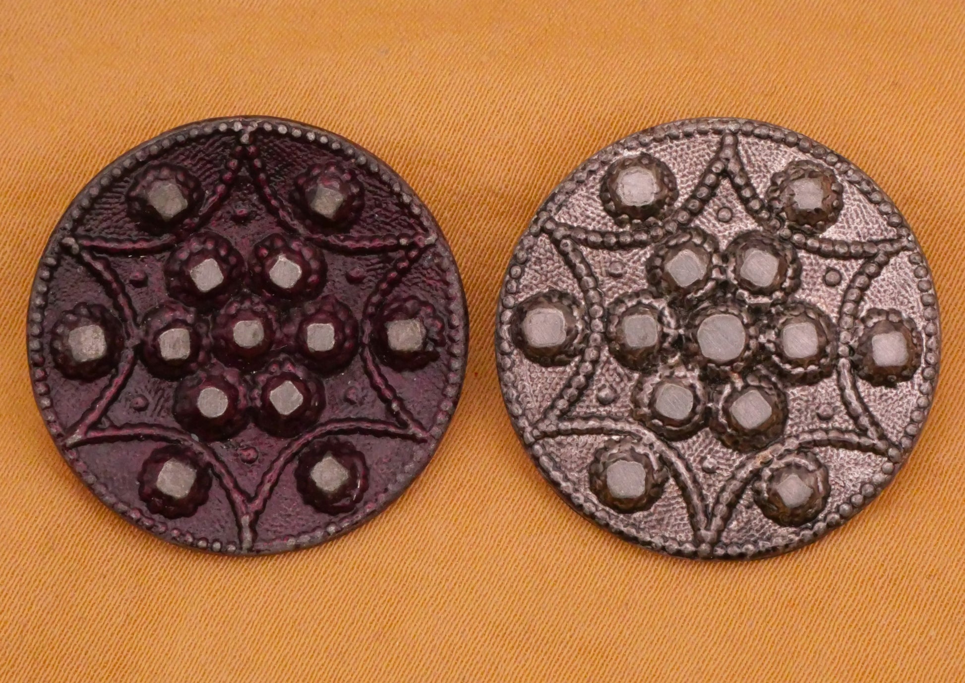 Excellent sun star design pewter metal buttons. Left has purple tint. Each measures 25mm / .98" in diameter. Choose left or right.