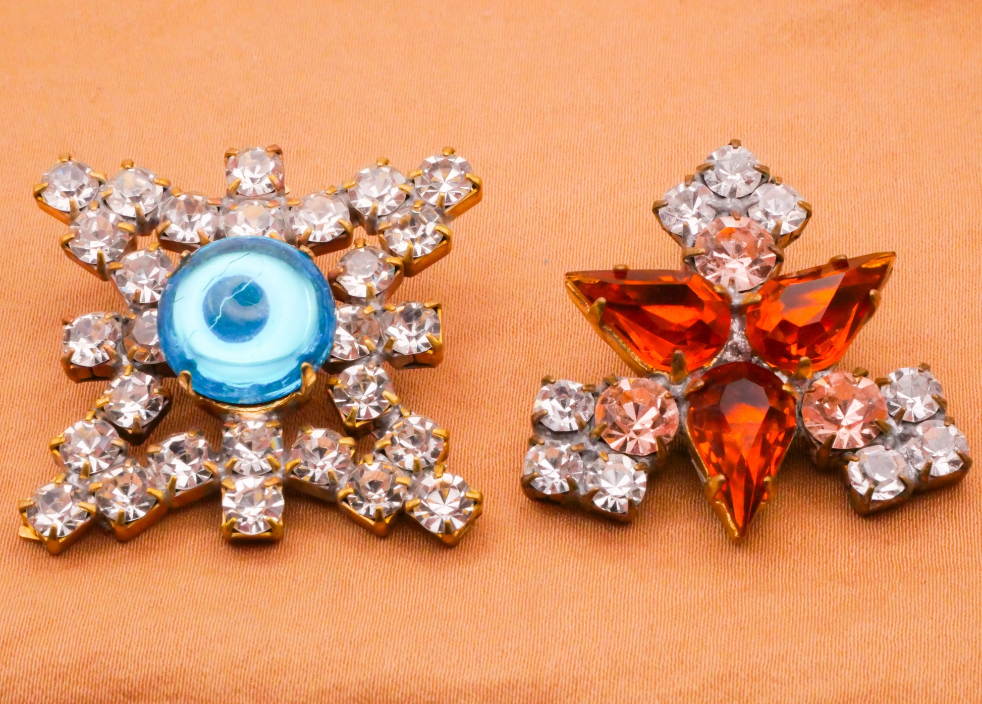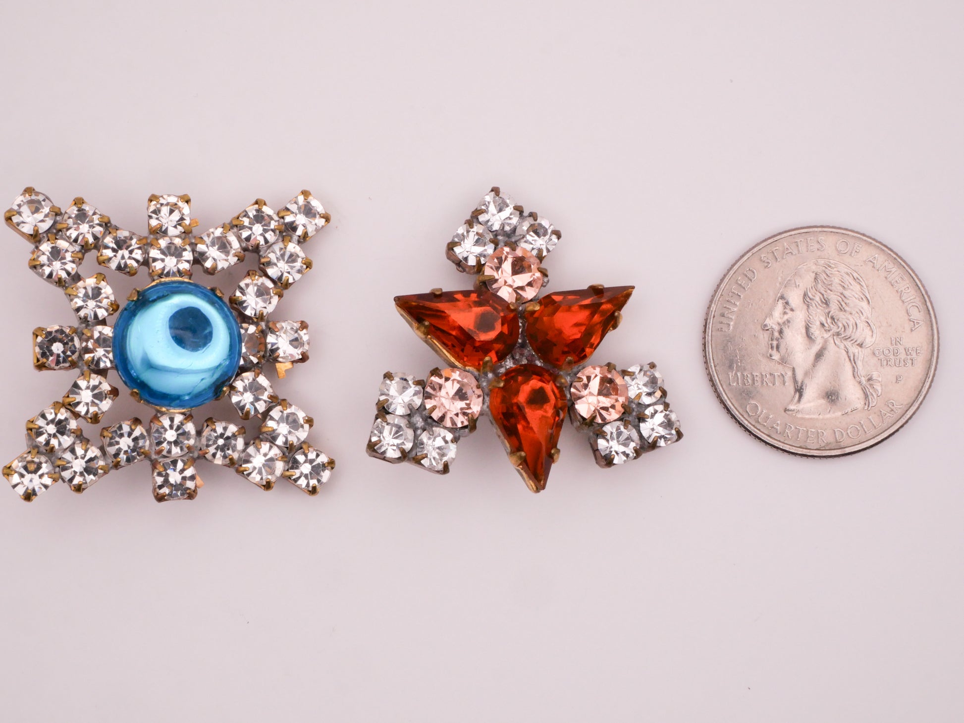 Gorgeous! These starburst design Czech glass rhinestone and metal buttons are so pretty! Left has aqua center stone and right has burnt orange and peachy pink stones in the center. These vintage buttons measure 31mm / 1.22" across. Choose left or right.