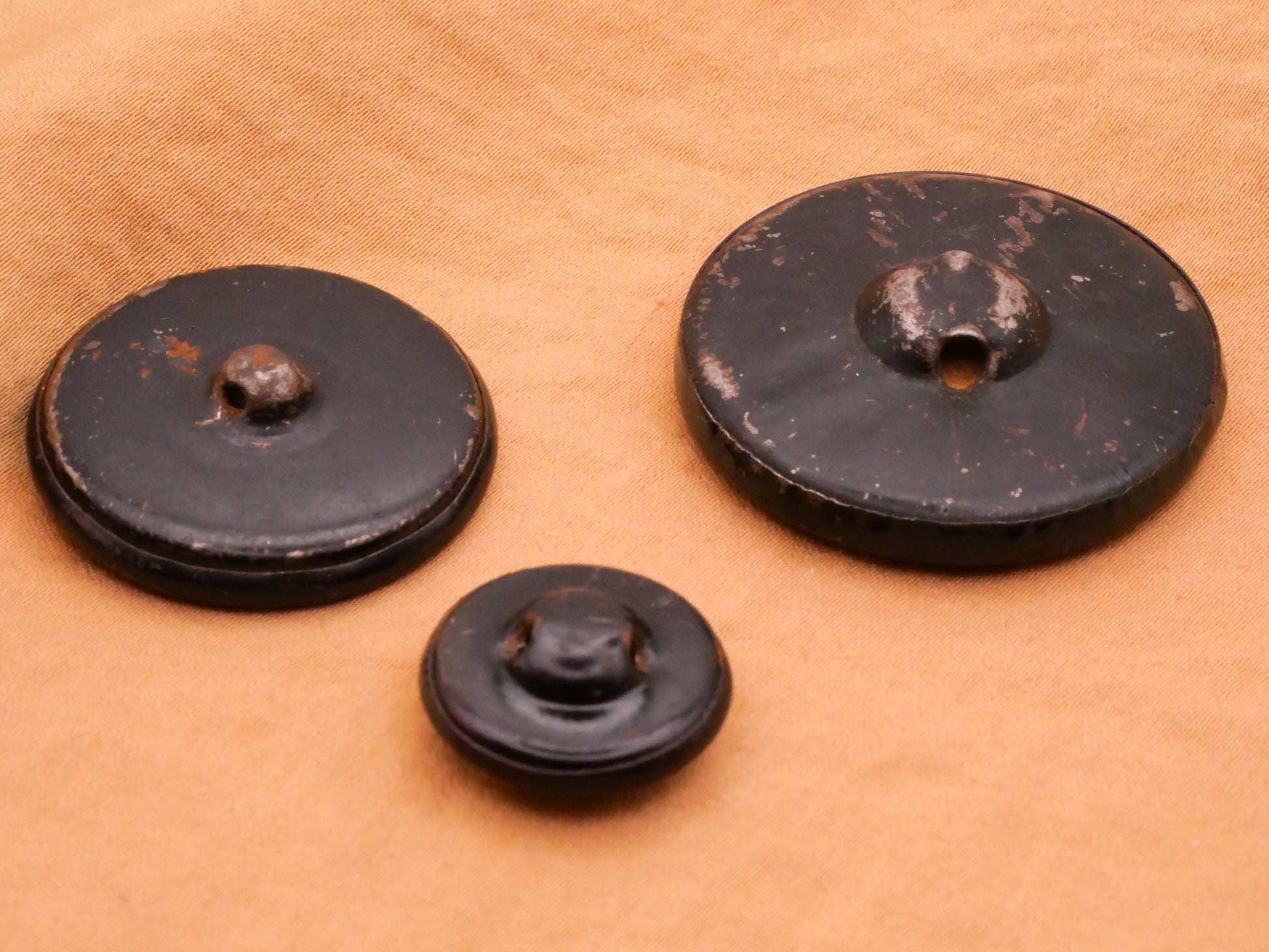 Choose your favorite black and white early plastic button. Left has iridescent shell look background (hard to see in pictures) and some wear along edge. These measure between 9-37mm / .35"-1.46". Choose left, center, or right.