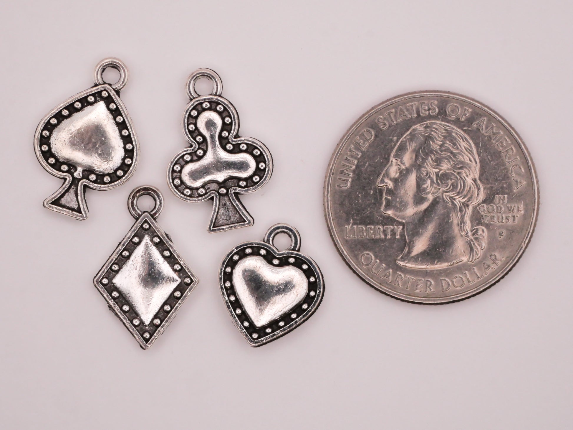 Excellent silver metal set of four playing card suit charms, including heart, club, diamond, and spade. These measure between 12-15mm / .47"-.59".