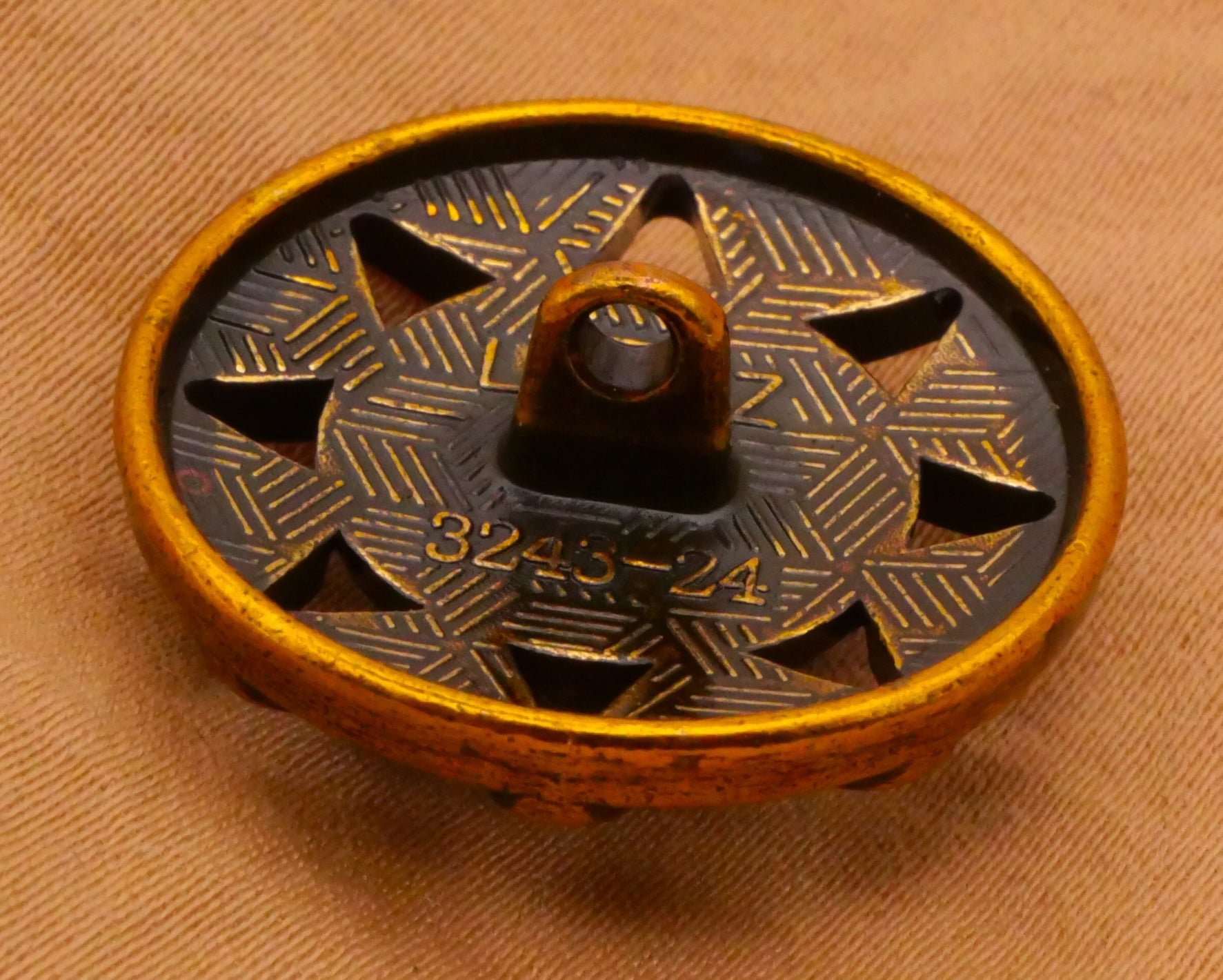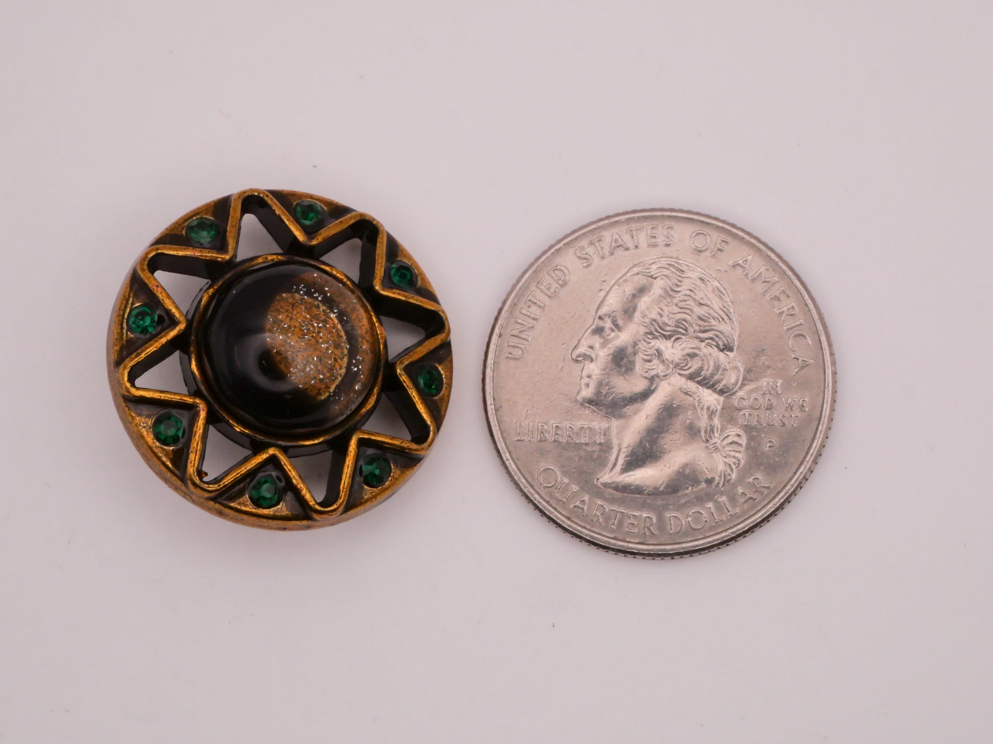 Very cool sun star pierced metal button with green rhinestone and two-tone glittery center orb. Measures 24mm / .95" in diameter.