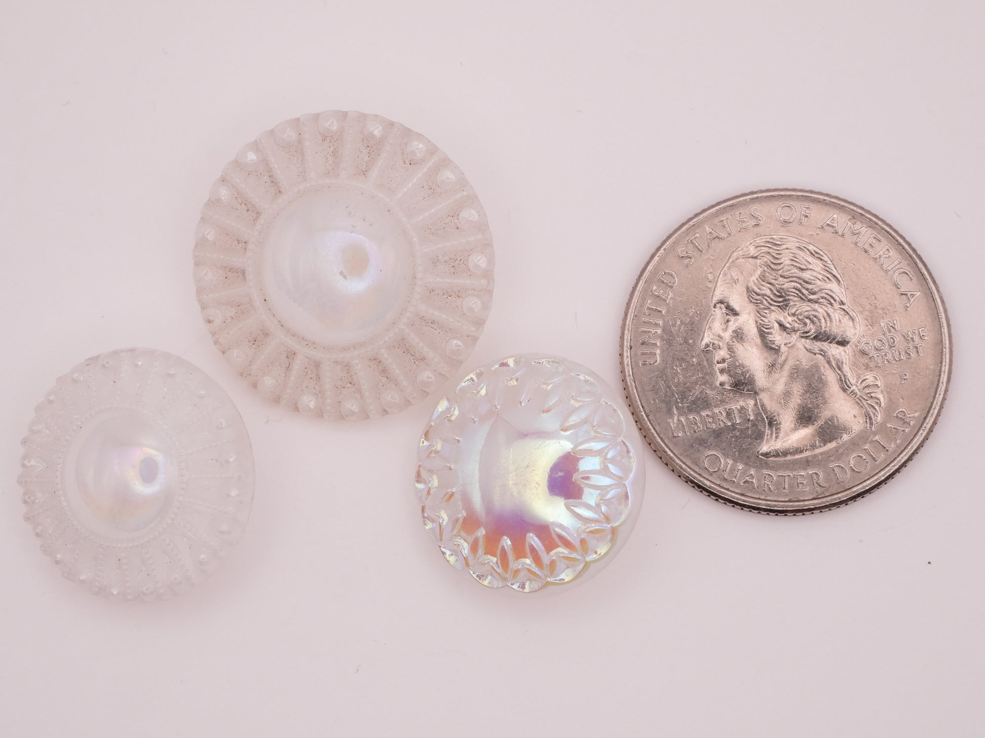 Gorgeous iridescent semi-translucent white glass with sunburst designs. Choose your favorite! These measure between 18-23mm / .71"-.91". Choose left, center, or right.