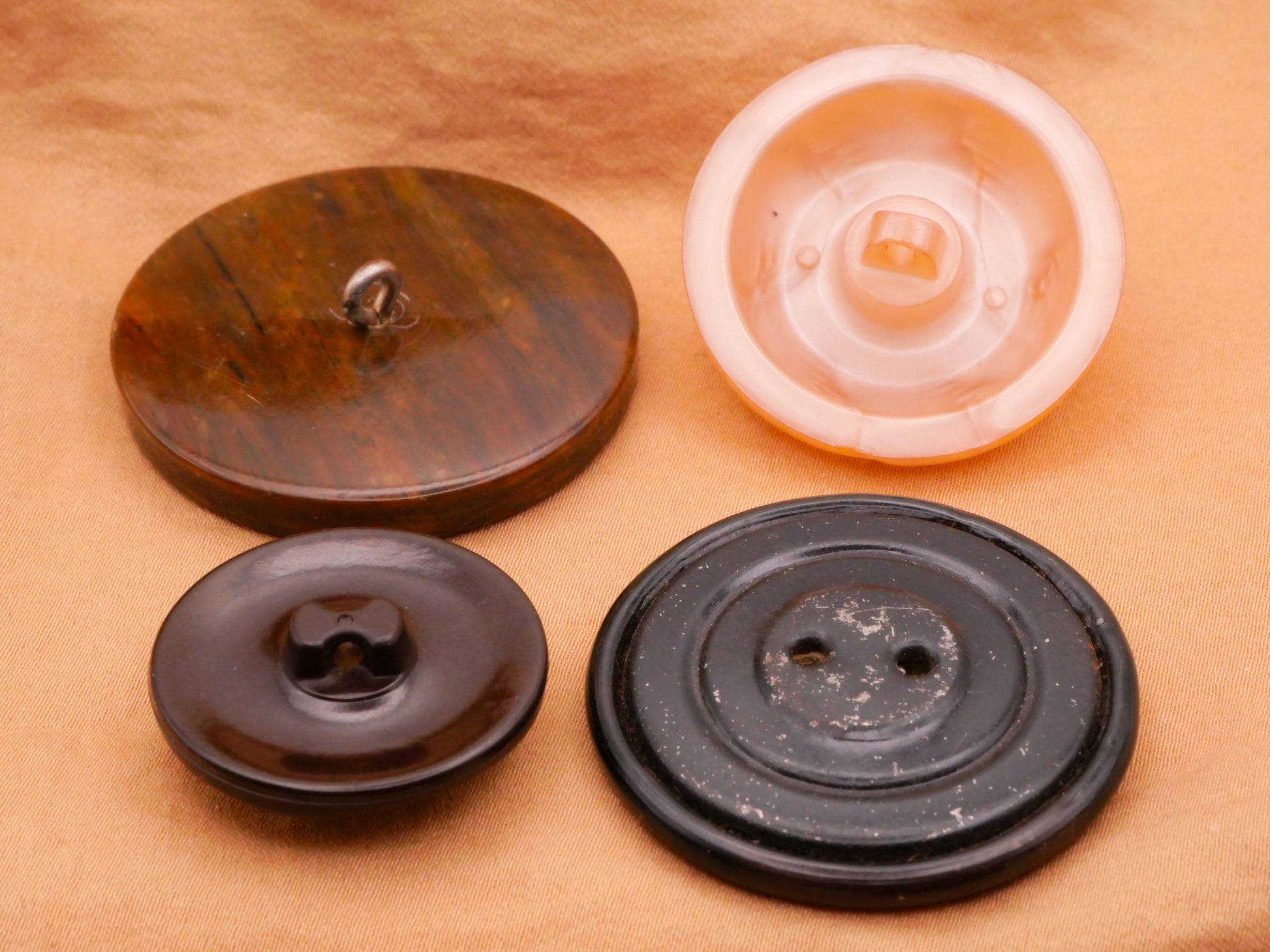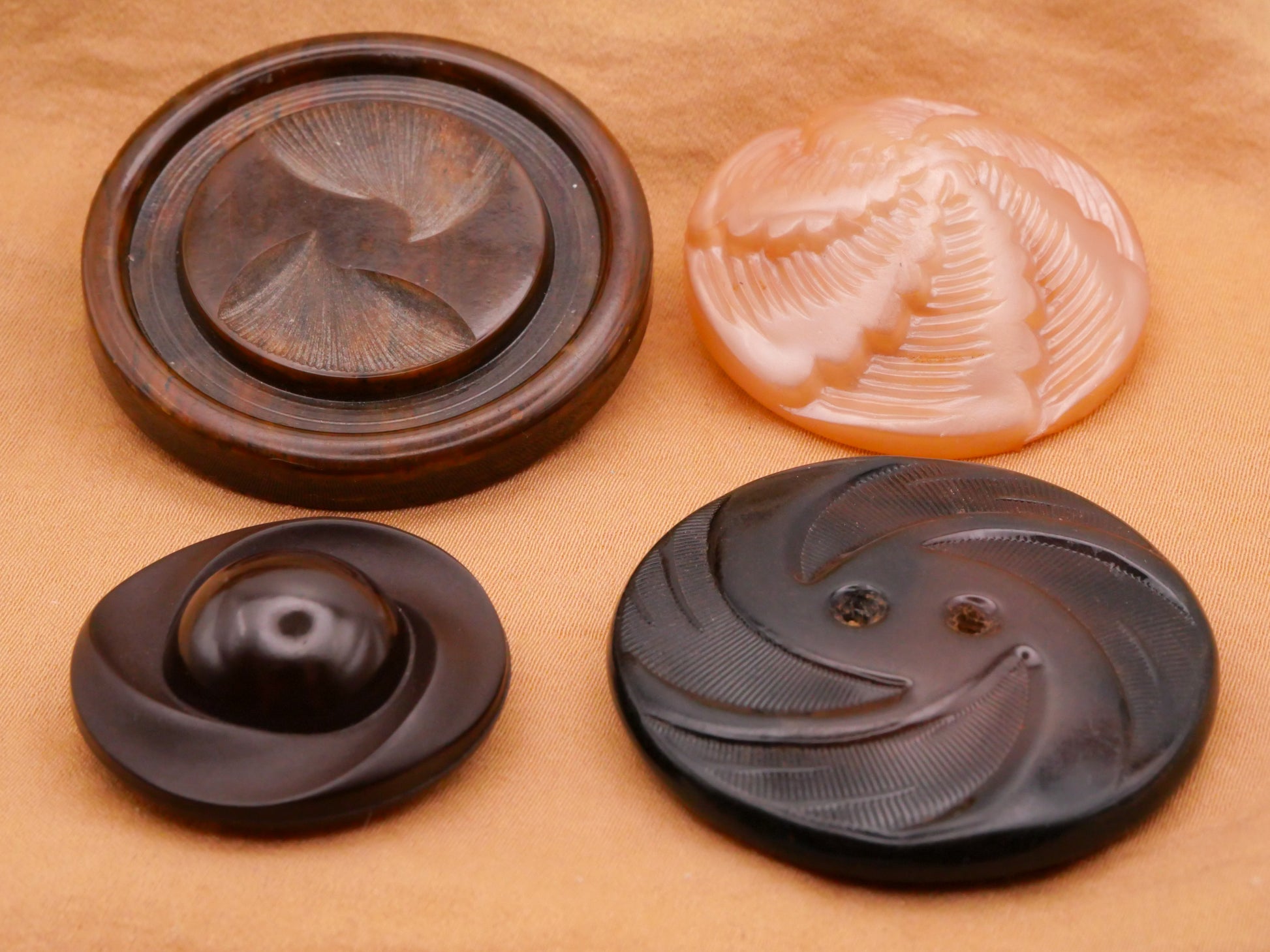 Spiral and swirl design brown and champagne colored early and vintage plastic buttons, choose your favorite! These measure between 27-40mm / 1.06"-1.57". Choose top or bottom and left or right.