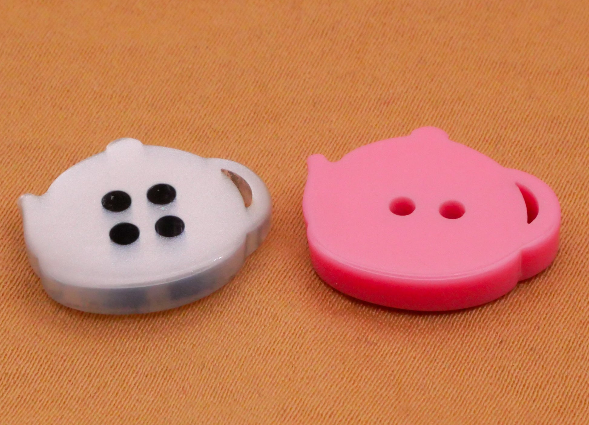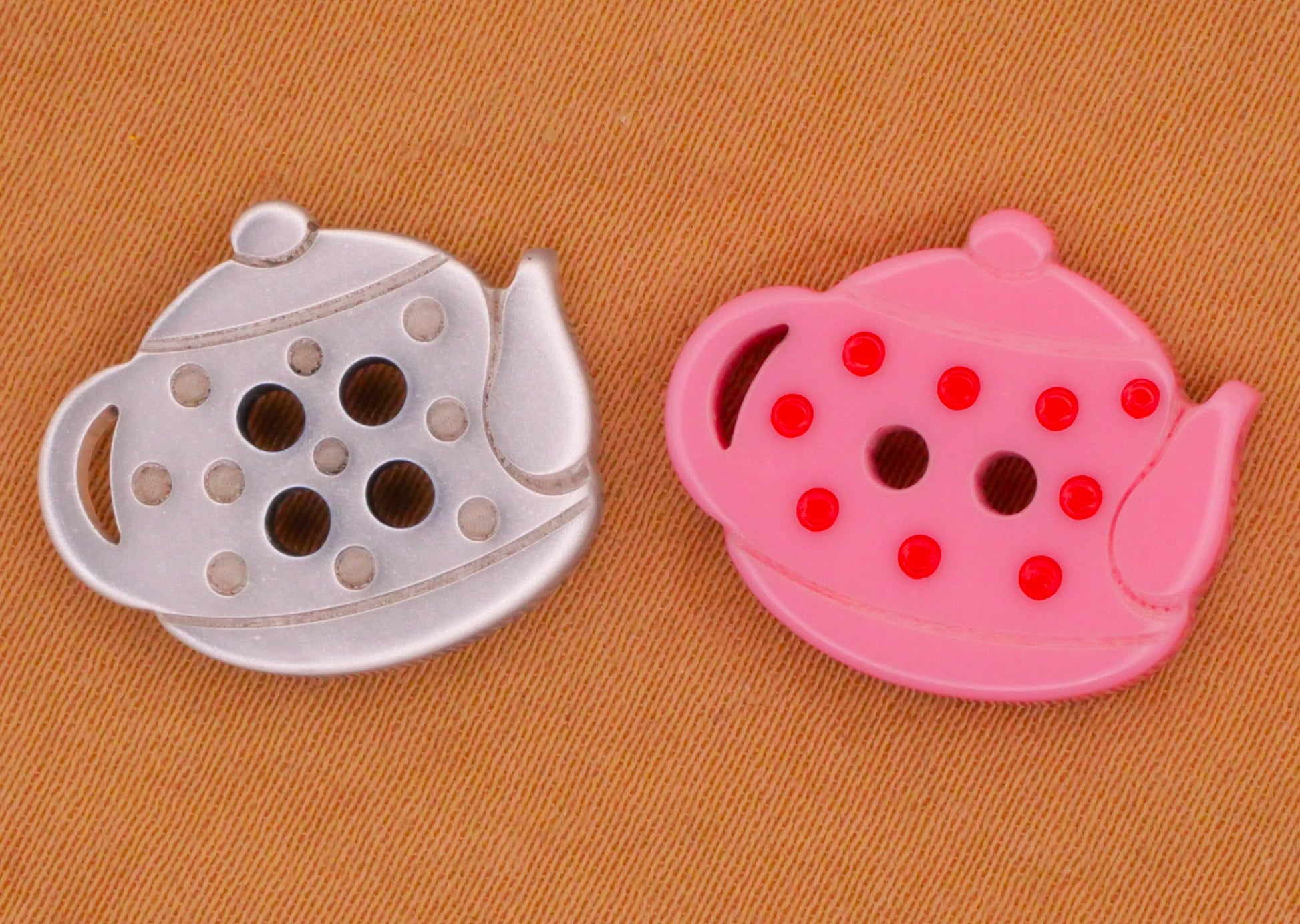 So cute! Polka dot teapot sew-thru plastic buttons. Sold in pairs, with two of whichever style you choose. Each button measures 15 x 18mm / .59" x .71". Choose left or right.