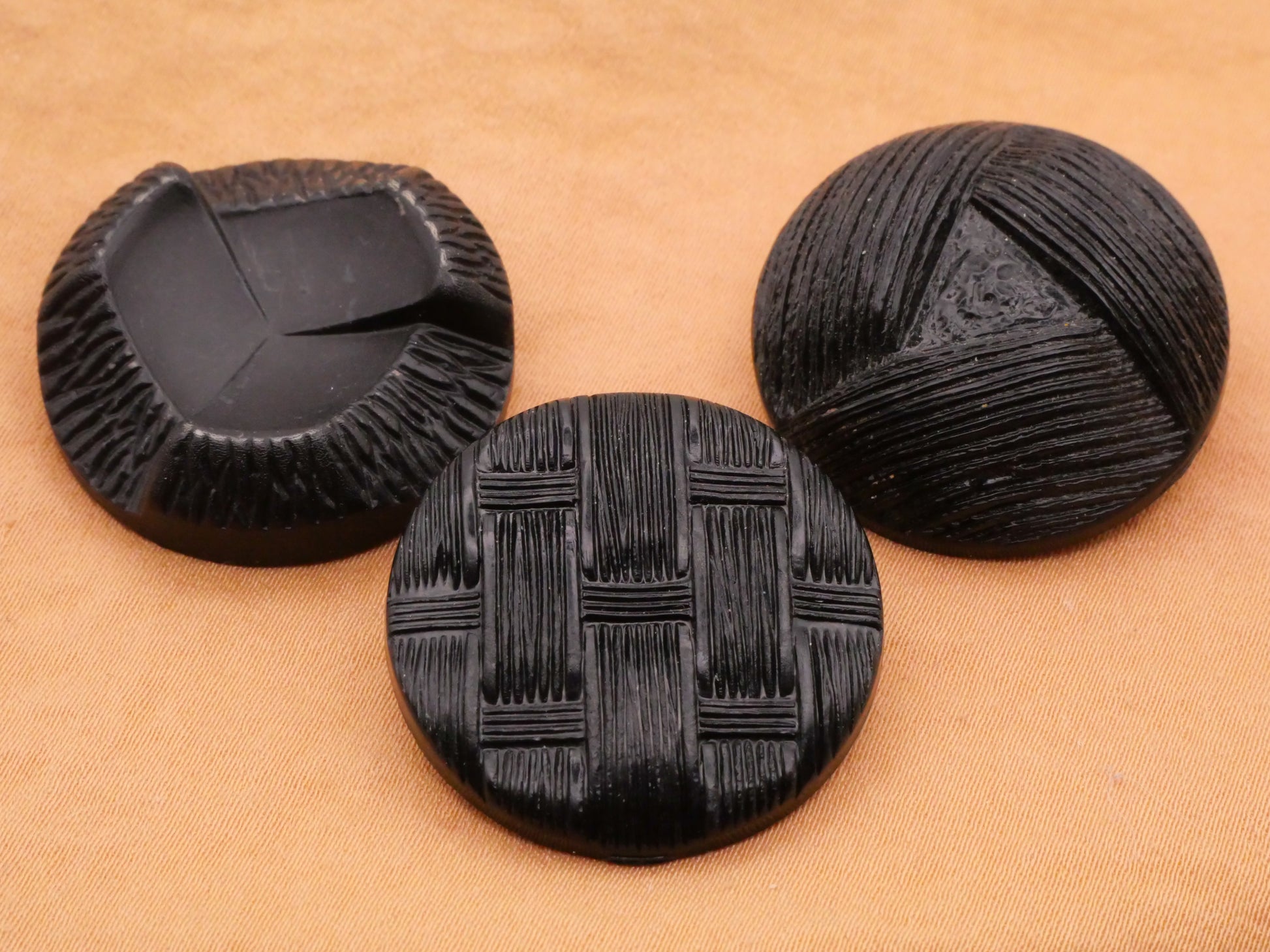 Excellent textured black vintage plastic button, choose your favorite! Love the one that looks like basket weave! Left looks like a buffed celluloid I've seen. These measure between 27-28mm / 1.06"-1.10" in diameter. Choose left, center, or right.