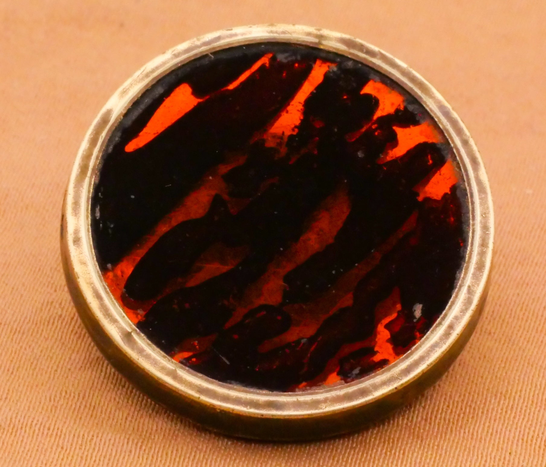 Stunning amber colored tiger stripe look glass and brass metal antique drum button. Measures 26mm / 1.02" in diameter.