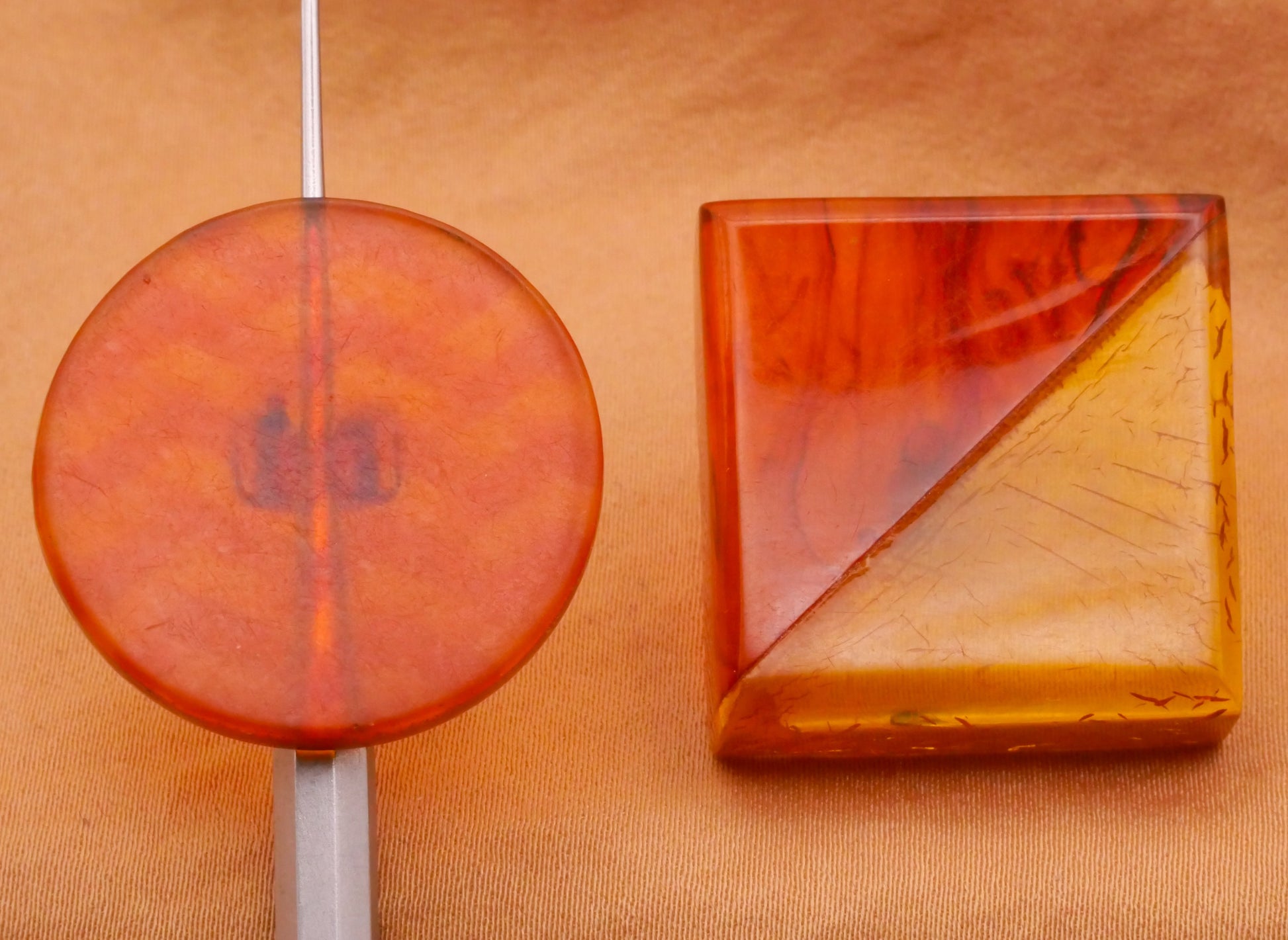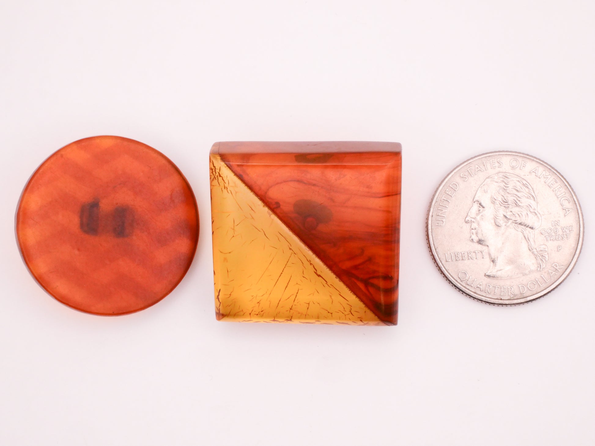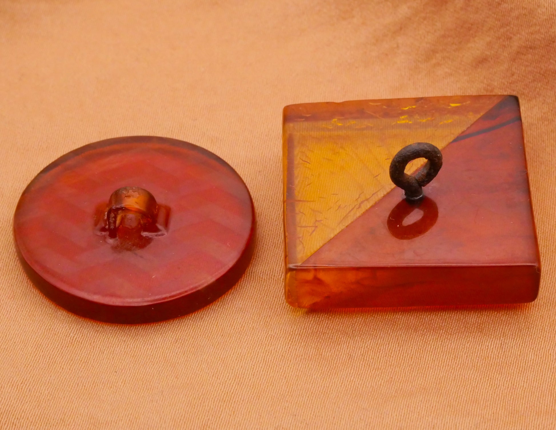 Fantastic tortoiseshell look buttons, left with zig zag design (early plastic) and right half root beer and half apple juice Bakelite (simichrome tested). These measure between 27-28mm / 1.06"-1.1". Choose left or right.