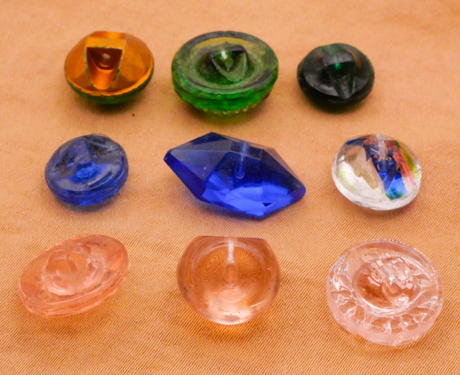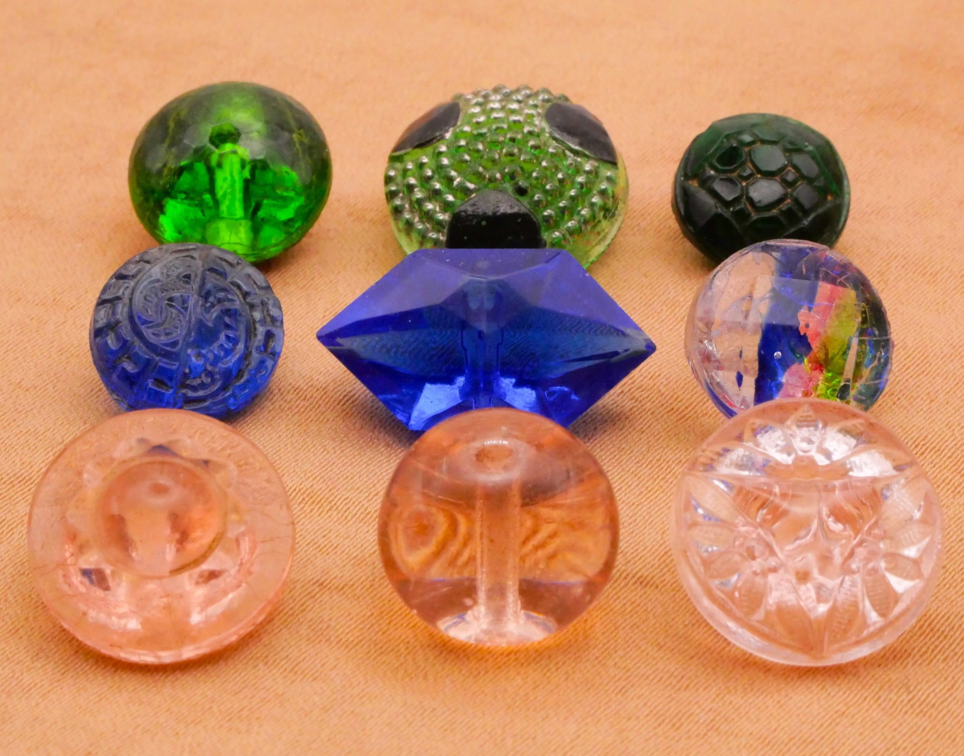 Fantastic transparent glass buttons in greens, blues, and pinks; choose your favorite! These vintage and antique buttons measure between 10-18mm / .39"-.71". Choose top, middle, or bottom and left, center, or right.