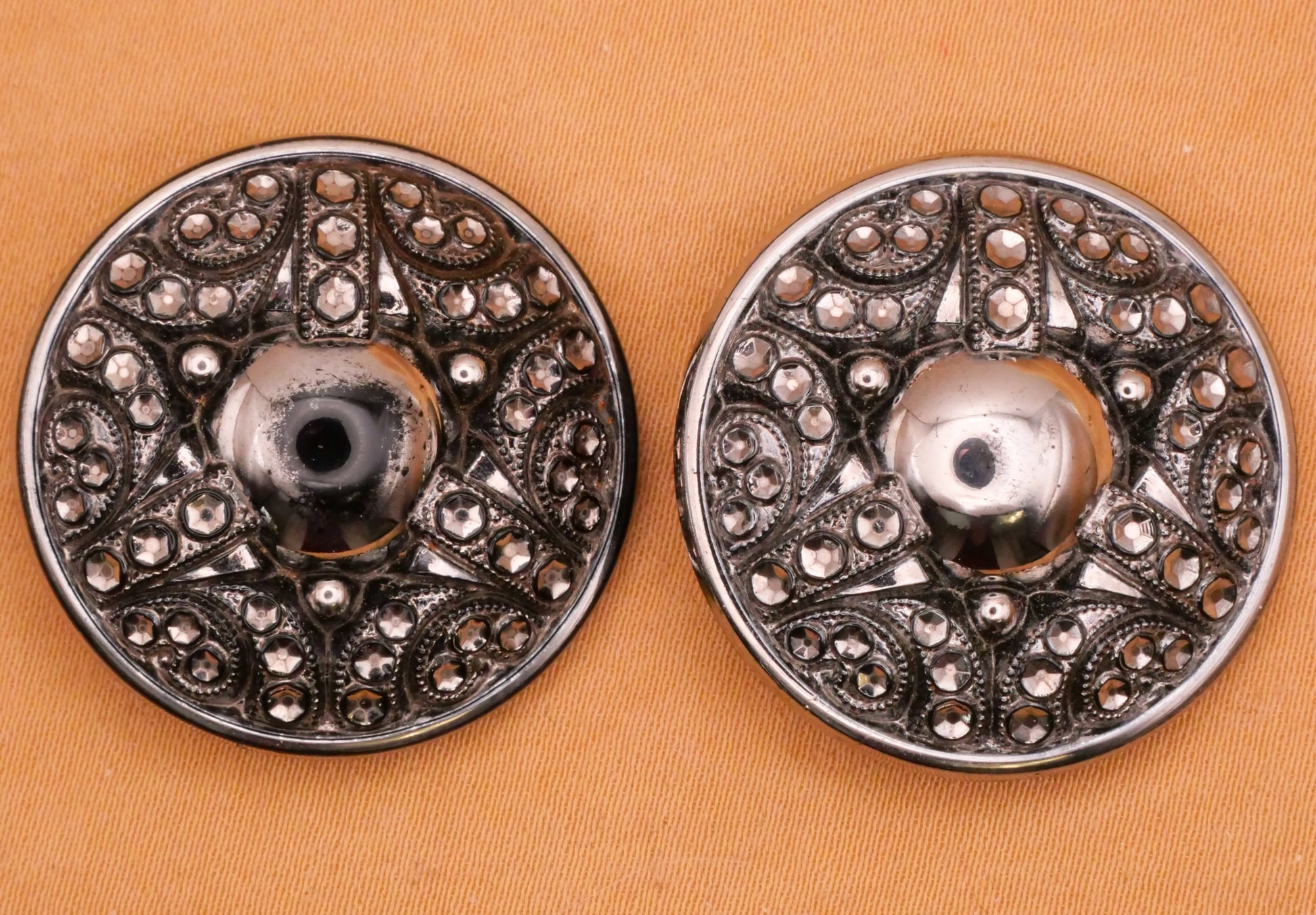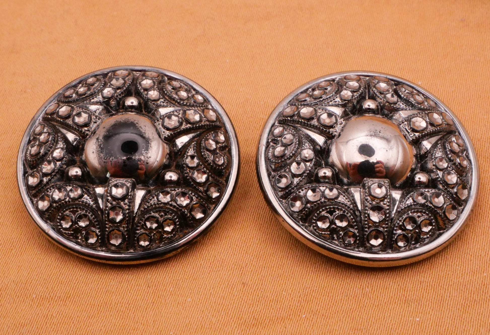 Stunning! Silver luster black glass button with filigree triad design. Left has silver luster missing from center dome. Each antique button measures 28mm / 1.1" in diameter. Choose left or right.