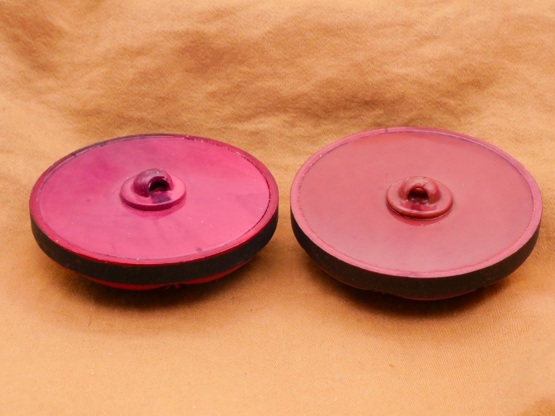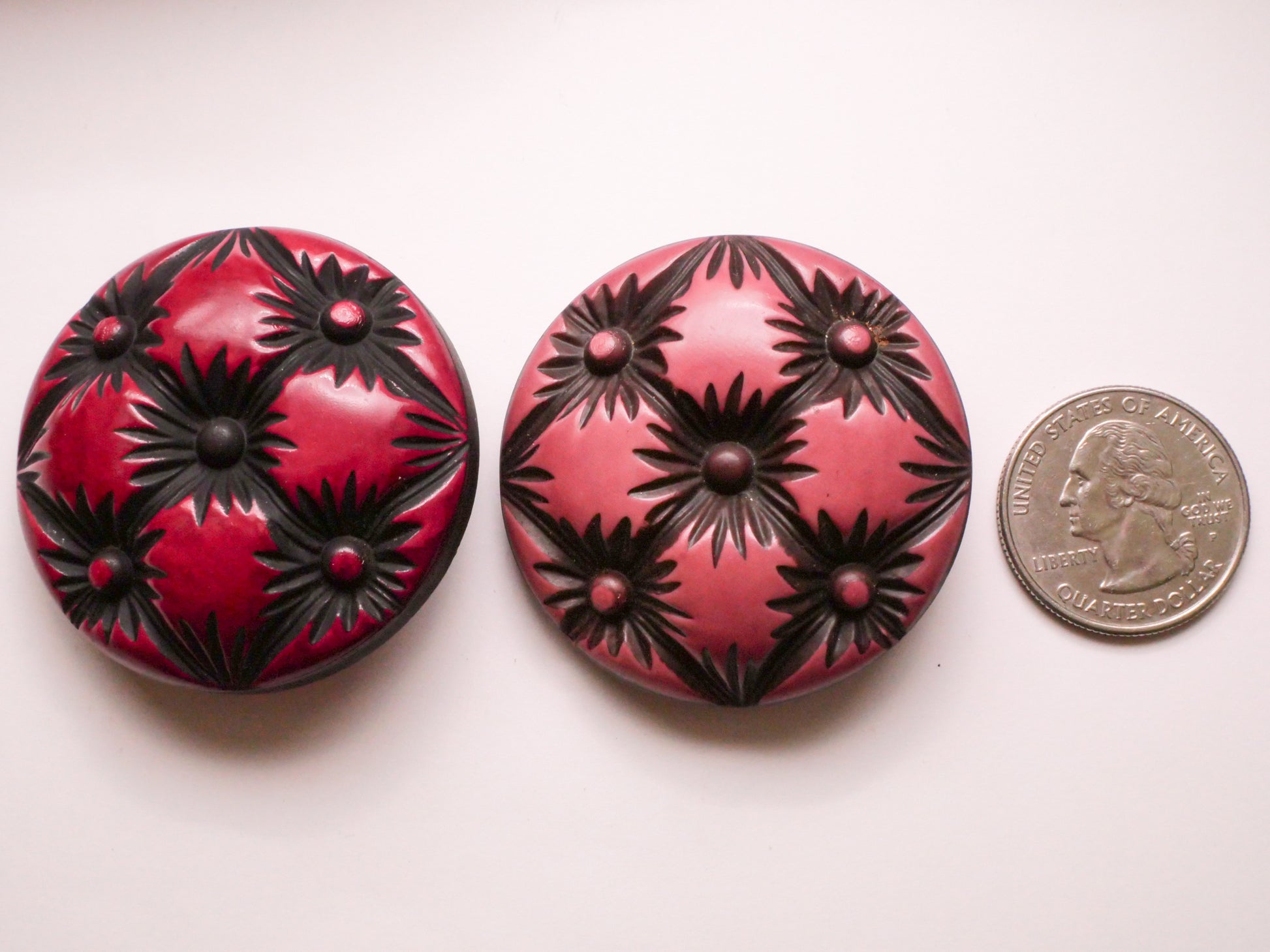 Amazing tufted design large buffed celluloid early plastic in shades of pink. Left is more of a magenta and right a shade of rose. Large size on these measuring 44mm / 1.73" in diameter. Choose left or right.