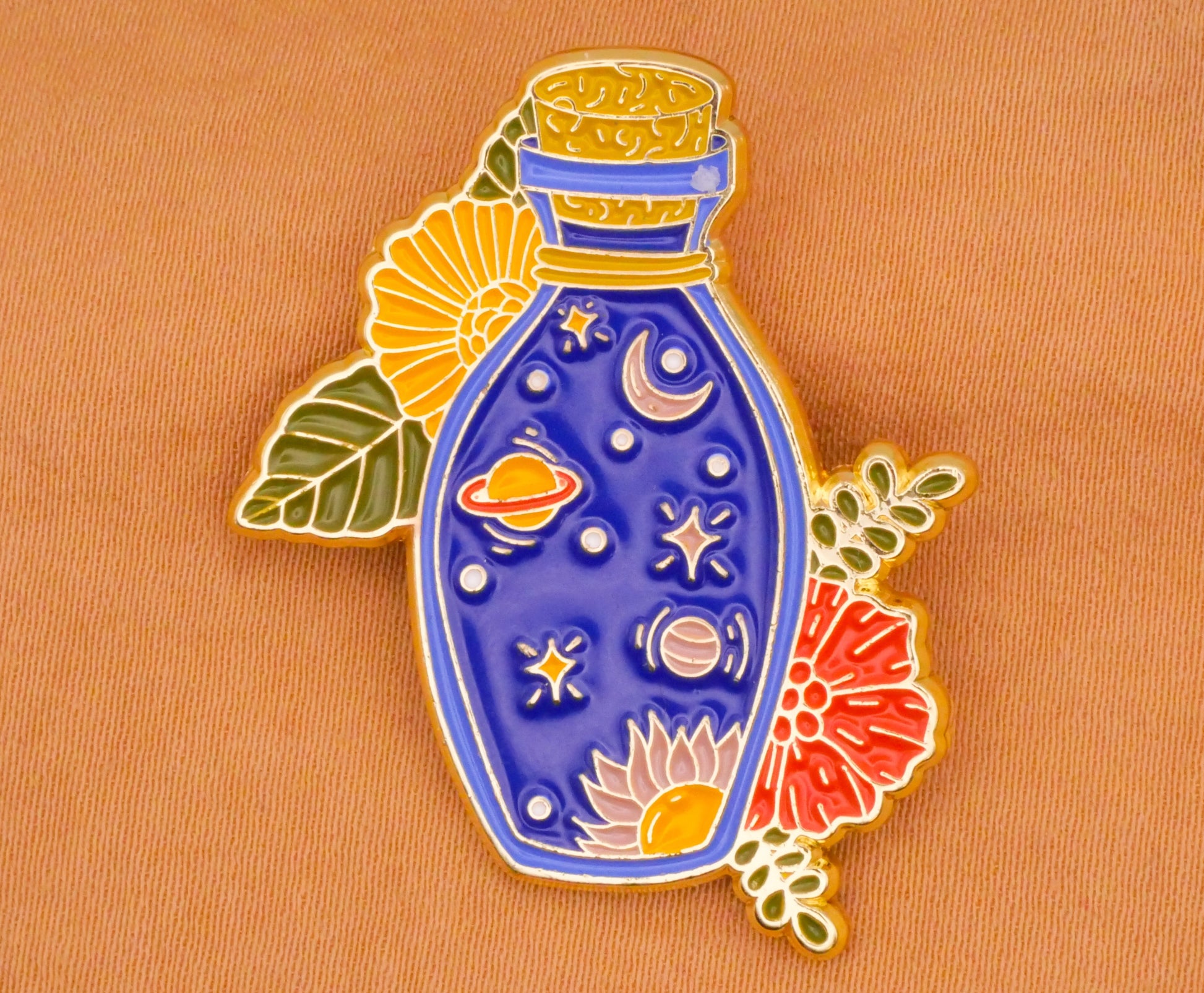 So cool! Potion bottle with outer space scene inside. Amazing! Enamel metal button measures a large 30 x 36mm / 1.18" x 1.42".