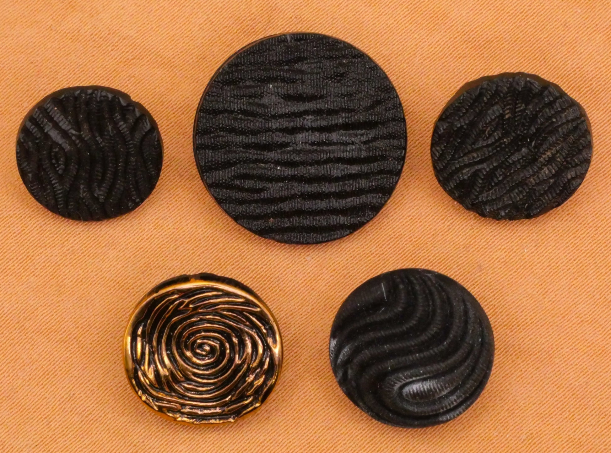 Very cool wood grain, ridge, or spiral look black glass buttons, choose your favorite. These measure between 12-18mm / .47"-.71". Choose top or bottom and left, center, or right.